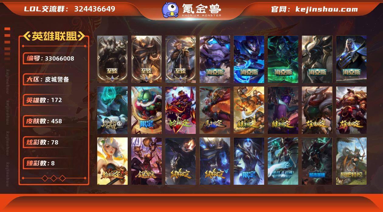 t39039【皮城警备】458皮肤 78炫彩 8臻彩 13神话/57限定/45传说/172英雄 账号等级:277 【重要头像】我麦是开的么 不错哦 【重要皮肤】机神玄武盖伦至臻 灵能特工伊泽瑞尔至臻 腥红之月亚托克斯至臻 腥红之月亚托克斯2022至臻 灰烬征服者潘森 海克斯科技斯维因 海克斯科技吉格斯 海克斯科技嘉文四世 零之枪骑赫卡里姆 摄魂使者薇恩 电玩女神厄运小姐 替父从军花木兰 春晖神女拉克丝 美猴王孙悟空 紫金罗刹莫甘娜 张辽文远 司马懿仲达 烈焰美人薇恩 神龙之翼库奇 觅心女王艾希 冰雪驯鹿波比 冬季仙境卡尔玛 冰封王子蒙多 魄罗骑士瑟庄妮 夺命美人卡特琳娜 死亡誓约劫 克烈古拉伯爵 御星魔矢艾希 FPX锤石 FPX普朗克 SSG霞 SKTT1艾克 SSW图奇 SSW辛吉德 SKTT1婕拉 暗杀星奥莉安娜 暗杀星蒙多 暗杀星慎 Fnatic迦娜 Fnatic古拉加斯 Fnatic嘉文四世 防暴士兵格雷福斯 防暴士兵辛吉德 防暴天使凯尔 钢铁之翼艾尼维亚 红桃杰克崔斯特 惊悚派对费德提克 蓝色忧郁崔斯特 密林猎手提莫 圣诞精灵崔丝塔娜 圣诞开心鬼提莫 圣诞狂欢基兰 圣诞老人古拉加斯 外星装甲库奇 喜庆之树茂凯 邪恶圣诞老人维迦 幸福女神乐芙兰 雪默丁格...