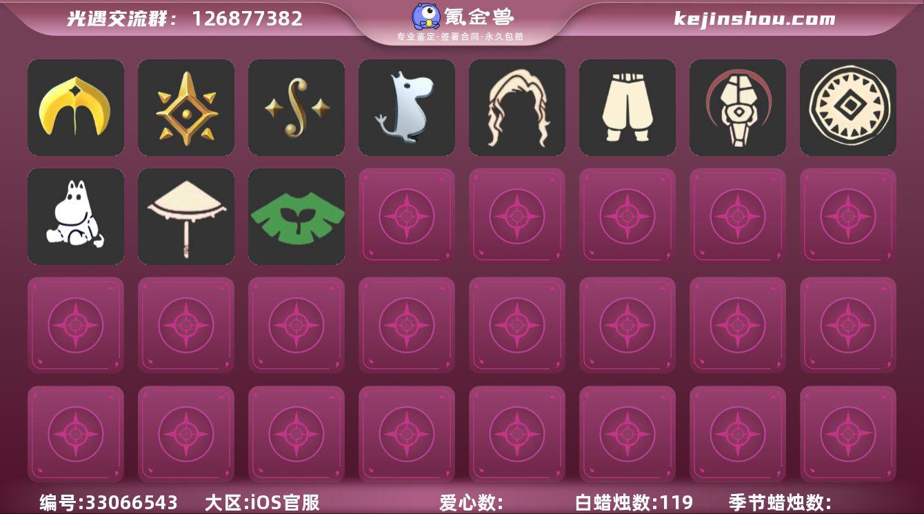 [18147369]账号类型: 手机账号 季节已毕业: 圣岛季,预言季,二重奏季,姆明季 完成地图: 晨岛,云野,雨林,霞谷,暮土 珍稀物品: 鳐鲲斗篷,阿努比斯(狗头) 礼包: 牛仔裤,兔子鞋,福娃,灯笼,橘子,兔子,四叶草,小提琴,拖鞋,创始人,日光耳环,满月耳坠,线框斗篷礼包 裤子: 武士裤,妮妮裙子 面具: 阿努比斯 发型: 若笠,虚荣 斗篷: 绿芽 配饰: 雨伞,姆明抱枕,小红伞,圆鼓,蓝色手碟 亮点: 【优质装备】:预言季,阿努比斯(狗头),武士裤,圣岛季,鳐鲲斗篷,妮妮裙子(妮妮长裙),姆明抱枕,小红伞(姆明红伞)(姆明大伞),二重奏季,姆明季,圆鼓(手拍大鼓),蓝色手碟(毕业手碟),福娃(福娃礼包)(春之日礼包)(铜钱斗),小提琴(凯旋提琴),线框斗篷礼包(周年线框斗篷),灯笼(中秋灯笼),牛仔裤(阔腿牛仔),晨岛,云野,雨林,霞谷,墓土(暮土),若笠(箬笠),拖鞋(夏日凉鞋),兔子鞋(兔子拖鞋),创始人(创始人斗篷),兔子(玉兔头饰)(玉兔发饰)(兔子发饰),日光耳环,满月耳坠,橘子(大橘大利),四叶草(四叶草头饰)