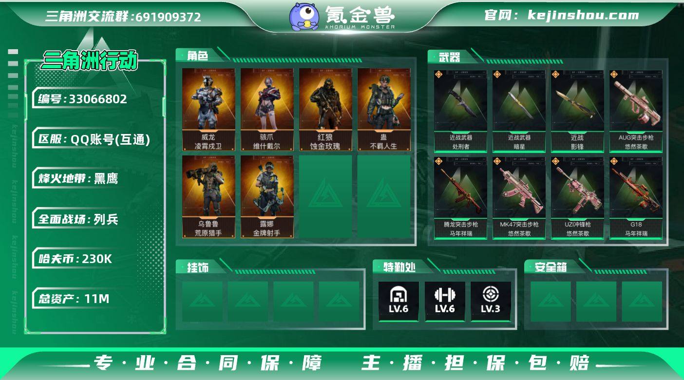 【SJZX1918】总资产(M):11M/哈夫币(K):230K/哈夫币(K):230K/传说枪皮数:22/全面战场等级:19_段位:列兵/烽火地带等级:60_段位:黑鹰/红狼-蚀金玫瑰/骇爪-维什戴尔/威龙-凌霄戍卫/露娜-金牌射手(S7)/乌鲁鲁-荒原猎手/蛊-不羁人生/近战-暗星/近战-影锋/近战-处刑者/近战-黑鹰/M4A1突击步枪-蚀金玫瑰/QBZ95-1突击步枪-凌霄戍卫/ASh-12战斗步枪-鹅鸭杀/AUG突击步枪-悠然茶歇/SG552突击步枪-运动员/SCAR-H战斗步枪-水墨云图/SCAR-H战斗步枪-启航/腾龙突击步枪-马年祥瑞/腾龙突击步枪-万金泪冠/MK47突击步枪-悠然茶歇/UZI冲锋枪-悠然茶歇/勇士冲锋枪-万金泪冠/QCQ171冲锋枪-鹅鸭杀/QJB201轻机枪-鹅鸭杀/M14射手步枪-蛮荒/M14射手步枪-缄花/SKS射手步枪-骑士/SR-25射手步枪-缄花/R93狙击步枪-维什戴尔/AWM狙击步枪-万金泪冠/.357左轮-缄花/G18-马年祥瑞/K416突击步枪-冬日风情/K416突击步枪-腊梅/K416突击步枪-阿萨拉特攻/M7战斗步枪-百步穿杨/G3战斗步枪-流沙送葬/AS Val突击步枪-百步穿杨/K437突击步枪-丛林谍踪/MP5冲锋枪-深海恐惧/MP5冲锋枪-战术竞备/MP5冲锋枪-竞技风/Vector冲锋枪-百步穿杨/Vector冲锋枪-异域战争/SMG45冲锋枪-阿萨拉特攻/SR-3M紧凑突击步枪-战术竞备/SR...