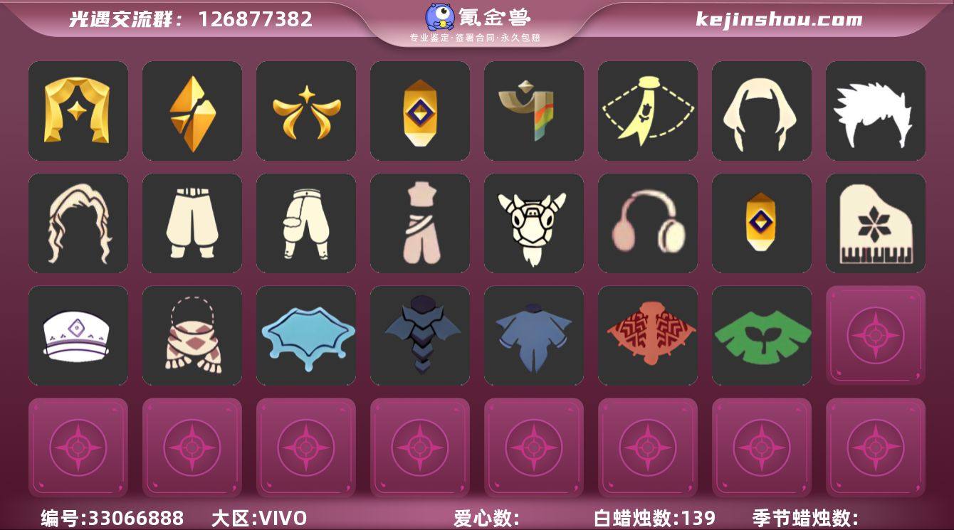[18147820]账号类型: 手机账号 季节已毕业: 表演季,破晓季,欧若拉季,追忆季,彩染季 完成地图: 晨岛,云野,雨林,霞谷,暮土,禁阁 珍稀物品: 白枭,透明蝶翼斗 礼包: 蝙蝠套,巫师,围巾,绊爱,鹿角,兔子鞋,瑞雪,橘子,红伞,兔子,枯角,雪花,四叶草,透明蛛丝,雪人鞋,新年耳钉,姆明饰品套装,献瑞折扇礼包 裤子: 武士裤,搓澡巾,蓝绿裤 面具: 黄眉企鹅面具,辉光羚羊面具 面饰: 红耳机 项链: 围巾 发型: 若笠,虚荣,小王子发型,留辫蘑菇头 头饰: 蓝色音乐会,平顶帽 斗篷: 海洋斗,绿芽,遥鲲斗篷,燕尾斗篷,冥龙斗篷,瑞雪斗篷,彩染围巾斗篷 配饰: 高音钢琴,鲲灯 亮点: 【优质装备】:表演季,白枭(帝企鹅发),武士裤,破晓季,透明蝶翼斗,欧若拉季(欧若拉),高音钢琴(白色高脚钢琴),追忆季,蓝绿裤(高领舞服),围巾(肩带),黄眉企鹅面具,小王子发型,留辫蘑菇头,遥鲲斗篷(双翼遥鲲斗),燕尾斗篷,冥龙斗篷,鲲灯(追忆之书),辉光羚羊面具,彩染季,蝙蝠套(蝙蝠斗篷)(南瓜头),绊爱(绊爱斗篷)(绊爱礼包),红耳机,围巾(小王子斗篷)(小王子围巾),鹿角(圣诞鹿角),瑞雪(瑞雪斗篷)(暖冬瑞雪),红伞(瑞气纸伞),透明蛛丝(透明蜘蛛斗),巫师(巫师帽),枯角(巫树犄角),晨岛,云野,雨林,霞谷,墓土(暮土),禁阁,若笠(箬笠),姆明饰品...