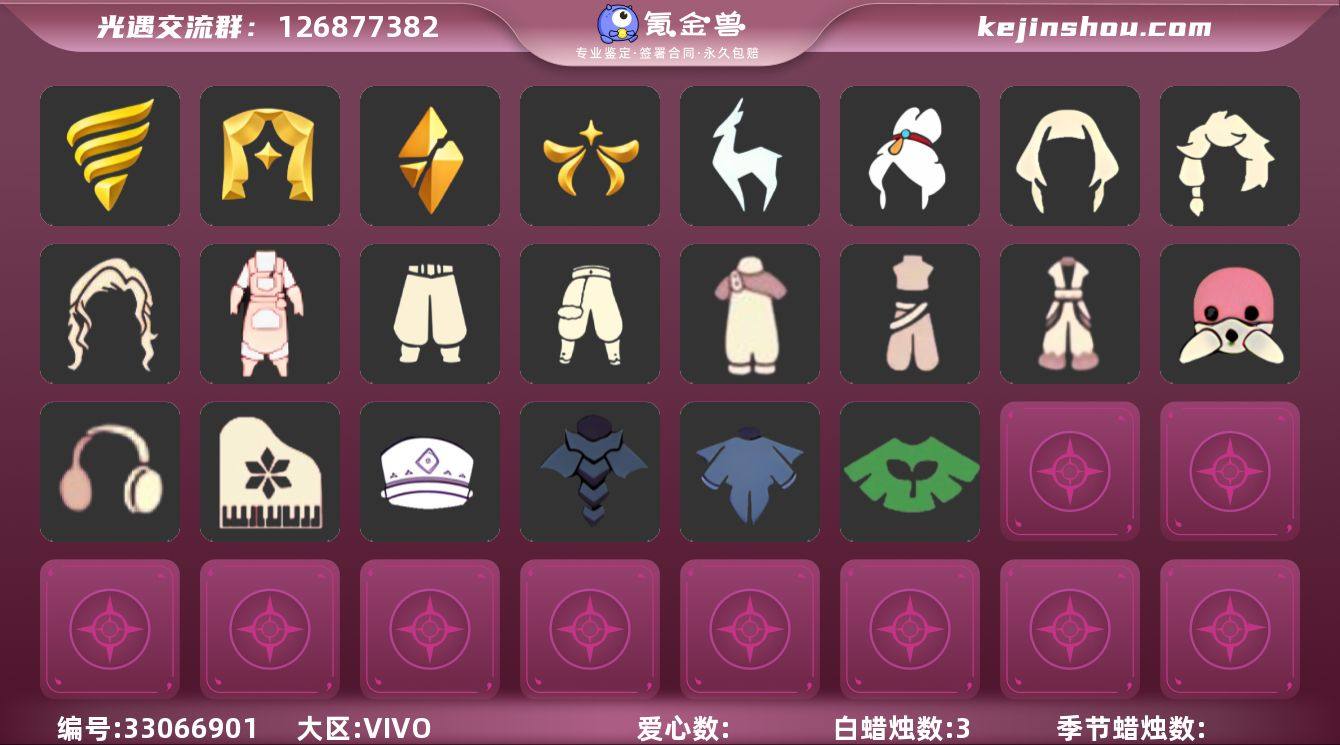 账号类型: 手机账号 季节已毕业: 潜海季,表演季,破晓季,欧若拉季,九色鹿季 完成地图: 晨岛,云野,雨林,霞谷,暮土,禁阁 珍稀物品: 白枭,透明蝶翼斗 礼包: 蝙蝠套,巫师,绊爱,鹿角,橘子,兔子,日光耳环,满月耳坠,献瑞折扇礼包 裤子: 武士裤,背带裤,搓澡巾,蓝绿裤,飞天裤,筑巢季·裤子 面具: 呼吸面具,黄眉企鹅面具 面饰: 红耳机 发型: 若笠,虚荣,单侧绑发,留辫蘑菇头,飞天盘发 头饰: 蓝色音乐会,平顶帽 斗篷: 海洋斗,绿芽,遥鲲斗篷,燕尾斗篷,冥龙斗篷 配饰: 高音钢琴,小红伞 亮点: 【优质装备】:表演季,白枭(帝企鹅发),武士裤,潜海季,破晓季,透明蝶翼斗,欧若拉季(欧若拉),高音钢琴(白色高脚钢琴),小红伞(姆明红伞)(姆明大伞),九色鹿(九色鹿季),蓝绿裤(高领舞服),飞天裤(柔缎花边连)(九色鹿丝带裤),筑巢季·裤子(设计师长袍),呼吸面具(潜水面具),黄眉企鹅面具,单侧绑发(单边小辫),留辫蘑菇头,遥鲲斗篷(双翼遥鲲斗),燕尾斗篷,冥龙斗篷,飞天盘发(九色鹿丸子头),蝙蝠套(蝙蝠斗篷)(南瓜头),绊爱(绊爱斗篷)(绊爱礼包),红耳机,鹿角(圣诞鹿角),巫师(巫师帽),晨岛,云野,雨林,霞谷,墓土(暮土),禁阁,若笠(箬笠),献瑞折扇礼包,兔子(玉兔头饰)(玉兔发饰)(兔子发饰),日光耳环,满月耳坠,橘子(大橘大...