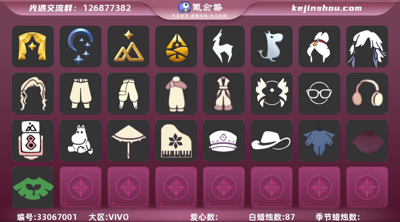 [18147494]账号类型: 手机账号 季节已毕业: 表演季,夜行季,拾光季,归巢季,九色鹿季,姆明季 完成地图: 霞谷,暮土 珍稀物品: 白枭,彩虹围巾 礼包: 蝙蝠套,巫师,围巾,欧若拉之翼,九色鹿角,荷叶伞,蜘蛛斗,牛仔裤,兔子鞋,南瓜,暗彩装扮,姆明饰品套装,小狗周年发饰,青衫落拓礼包 裤子: 武士裤,背带裤,搓澡巾,妮妮裙子,飞天裤 面具: 夜行毕业面具,黄眉企鹅面具 面饰: 红耳机,黑框眼镜,青鸟毕业面饰 发型: 归巢毕业发型,若笠,虚荣,飞天盘发 头饰: 牛仔帽,蓝色音乐会,平顶帽 斗篷: 海洋斗,绿芽,粉红绒毛斗篷,燕尾斗篷 配饰: 雨伞,高音钢琴,姆明抱枕,小红伞,相机 亮点: 【优质装备】:表演季,白枭(帝企鹅发),武士裤,归巢毕业发型(五塑彩羽发),高音钢琴(白色高脚钢琴),夜行季,妮妮裙子(妮妮长裙),牛仔帽(西部帽),姆明抱枕,小红伞(姆明红伞)(姆明大伞),相机(季卡相机),拾光季,彩虹围巾(五塑彩带斗),归巢季,九色鹿(九色鹿季),飞天裤(柔缎花边连)(九色鹿丝带裤),姆明季,夜行毕业面具(棕熊面具),黄眉企鹅面具,黑框眼镜(粗框眼镜),粉红绒毛斗篷(绒毛斗篷),燕尾斗篷,飞天盘发(九色鹿丸子头),青鸟毕业面饰(青鸟面饰),蝙蝠套(蝙蝠斗篷)(南瓜头),欧若拉之翼,红耳机,围巾(小王子斗篷)(小王子围巾),九...