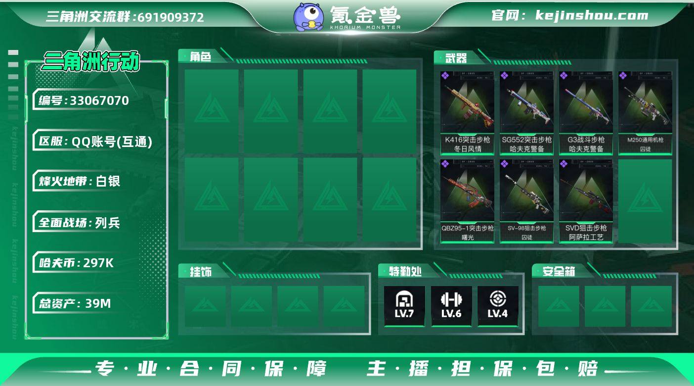 【PTSJZ3823】总资产(M):39M/哈夫币(K):297K/哈夫币(K):297K/全面战场等级:10_段位:列兵/烽火地带等级:60_段位:白银/近战-黑鹰/QBZ95-1突击步枪-曙光/K416突击步枪-冬日风情/SG552突击步枪-哈夫克警备/G3战斗步枪-哈夫克警备/M250通用机枪-囚徒/SVD狙击步枪-阿萨拉工艺/SV-98狙击步枪-囚徒/SG552突击步枪-2026/MK47突击步枪-冰河潜伏者/野牛冲锋枪-冰河潜伏者/SMG-45冲锋枪-行动开启/勇士冲锋枪-冰天雪地/M1014霰弹枪-幻影结构/M4A1突击步枪-粉色涂装/M4A1突击步枪-高雅黑/M4A1突击步枪-海色/QBZ95-1突击步枪-高雅黑/QBZ95-1突击步枪-海色/QBZ95-1突击步枪-2026/K416突击步枪-高雅黑/M16A4突击步枪-高雅黑/M7战斗步枪-黑巧甜心/SCAR-H战斗步枪-数码迷彩/AS Val突击步枪-黑巧甜心/MP5冲锋枪-黄蜂/野牛冲锋枪-高雅黑/勇士冲锋枪-磐石/M1014霰弹枪-海浪/PKM通用机枪-变色龙/M249轻机枪-黄蜂/SKS射手步枪-三角洲力量/SR-25射手步枪-黑巧甜心/G17-2026/崩岩重炮/暗行哨兵/挂饰-牛角/挂饰-关山难越/挂饰-紧急撤离/挂饰-麻将