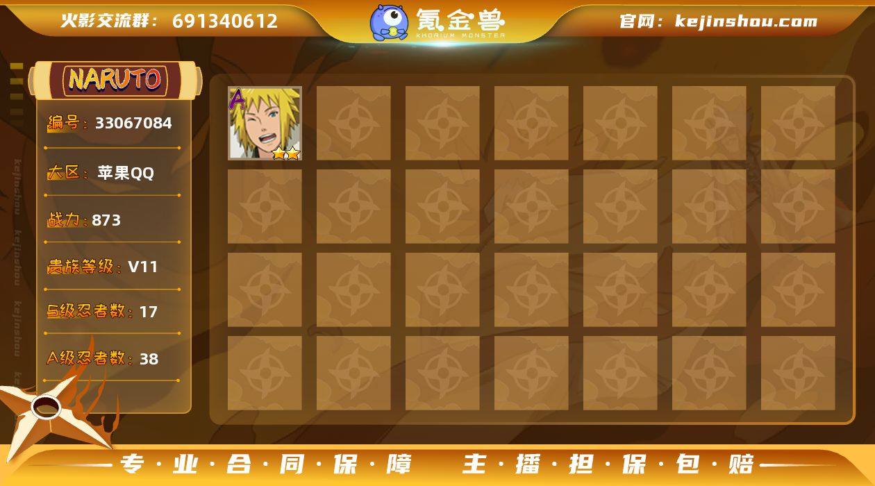 [18224658]实名: 可修改 贵族等级: V11 S忍数: 17 A忍数: 38 战力值(万): 873 S级忍者: 猿飞日斩「秽土转生」,佩恩「天道」,波风水门,宇智波鼬 「须佐能乎」,自来也 「舞之豪杰」,宇智波斑「白面具」,神秘面具男 「红夜之刃」,宇智波佐助「永恒万花筒」,千手柱间·木叶创立,宇智波斑「秽土转生·解」,艾「忍界大战」,大筒木舍人 「最终章」,自来也 「传说中的三忍」,漩涡鸣人 「暴怒·第六尾」,宇智波斑「五影会谈」,漩涡鸣人·宇智波佐助,宇智波带土「十尾人柱力」 亮点: 【优质装备】:猿飞日斩「秽土转生」,宇智波斑「白面具」,神秘面具男 「红夜之刃」,宇智波佐助「永恒万花筒」,千手柱间·木叶创立,宇智波斑「秽土转生·解」,艾「忍界大战」,大筒木舍人 「最终章」,自来也 「传说中的三忍」,漩涡鸣人 「暴怒·第六尾」,波风水门「新春限定」,宇智波带土「漂泊浪客」