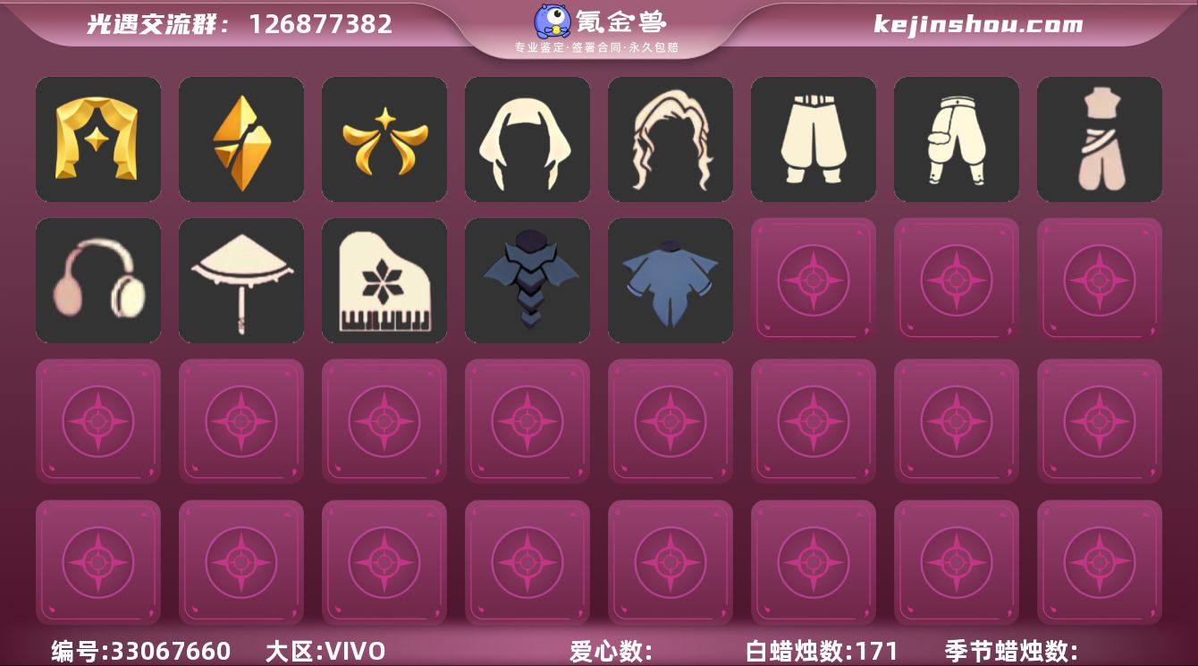账号类型: 手机账号 季节已毕业: 表演季,破晓季,欧若拉季 完成地图: 晨岛,霞谷 珍稀物品: 白枭,透明蝶翼斗 礼包: 巫师,绊爱,秋千,茶桌,白绒金,橘子,贝壳,兔子,南瓜,彩虹耳钉,创始人 裤子: 武士裤,搓澡巾,蓝绿裤 面具: 黄眉企鹅面具 面饰: 红耳机 发型: 若笠,虚荣,留辫蘑菇头 斗篷: 海洋斗,遥鲲斗篷,燕尾斗篷,冥龙斗篷 配饰: 雨伞,高音钢琴 亮点: 【优质装备】:表演季,白枭(帝企鹅发),武士裤,破晓季,透明蝶翼斗,欧若拉季(欧若拉),高音钢琴(白色高脚钢琴),蓝绿裤(高领舞服),黄眉企鹅面具,留辫蘑菇头,遥鲲斗篷(双翼遥鲲斗),燕尾斗篷,冥龙斗篷,绊爱(绊爱斗篷)(绊爱礼包),秋千(情人秋千),茶桌(花憩茶桌),红耳机,巫师(巫师帽),白绒金(白雪斗篷),晨岛,霞谷,若笠(箬笠),创始人(创始人斗篷),兔子(玉兔头饰)(玉兔发饰)(兔子发饰),彩虹耳钉(彩虹耳饰),南瓜(冥龙南瓜),橘子(大橘大利),贝壳(贝壳发饰)