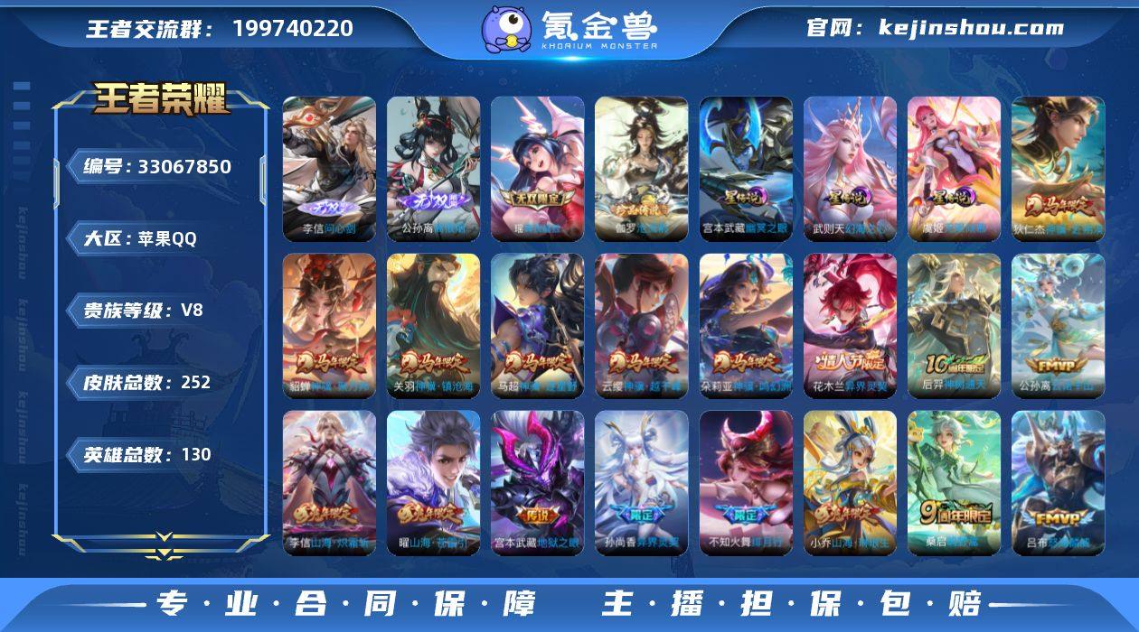 苹果Q-V8-至尊星耀II段位-130英雄-252皮肤-1典藏英雄-3无双-1珍品传说-22传说-53史诗 幸运值252 【英雄全皮】:孙权全皮,敖隐全皮 【荣耀典藏】:武则天英雄 【无双皮肤】:李信问心剑,公孙离离恨烟,瑶真我赫兹 【珍品传说】:伽罗沧流箭 【传说皮肤】:云缨神骥越千峰,关羽神骥镇沧海,朵莉亚神骥鸣幻洲,狄仁杰神骥赴朔漠,貂蝉神骥聚万邦,马超神骥逐星野,花木兰异界灵契,后羿神树通天,公孙离云诺千山,桑启鸣野蒿,虞姬无限倾心,小乔山海琳琅生,曜山海苍雷引,李信山海炽霜斩,吕布怒海麟威,不知火舞绯月行,王昭君星穹之声,孙尚香异界灵契,虞姬启明星使,张良黄金白羊座,宫本武藏地狱之眼,武则天海洋之心 【限定皮肤】:白起狰,公孙离离恨烟,姜子牙天穹之誓,狄仁杰阴阳师,虞姬凯尔特女王,小乔山海琳琅生,赵云皇家上将,孙尚香异界灵契,庄周高山流水,高渐离死亡摇滚,钟无艳超时空战士,孙膑妖精王,扁鹊炼金王,元歌无心,夏侯惇朔风刀,甄姬游园惊梦,甄姬落雪兰心,典韦穷奇,狄仁杰魔术师,狄仁杰万华元夜,达摩沙漠行僧,项羽海滩派对,老夫子醍醐杖,程咬金演武夺筹,王昭君星穹之声,兰陵王金庭之子,不知火舞绯月行,牛魔御旌,后羿圣弓游...