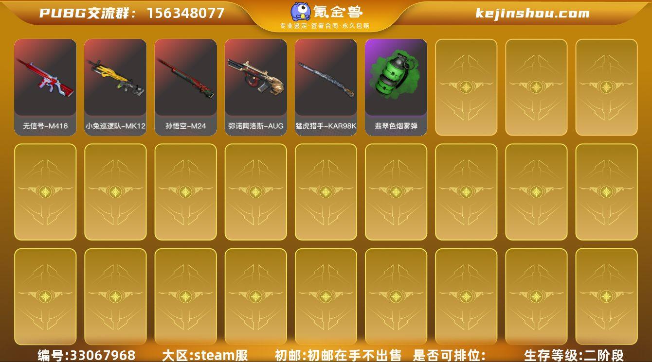 段位:未定级 生存等级:三阶段 卖家说:九级金龙 六级m24杜卡迪 虎牙夹克