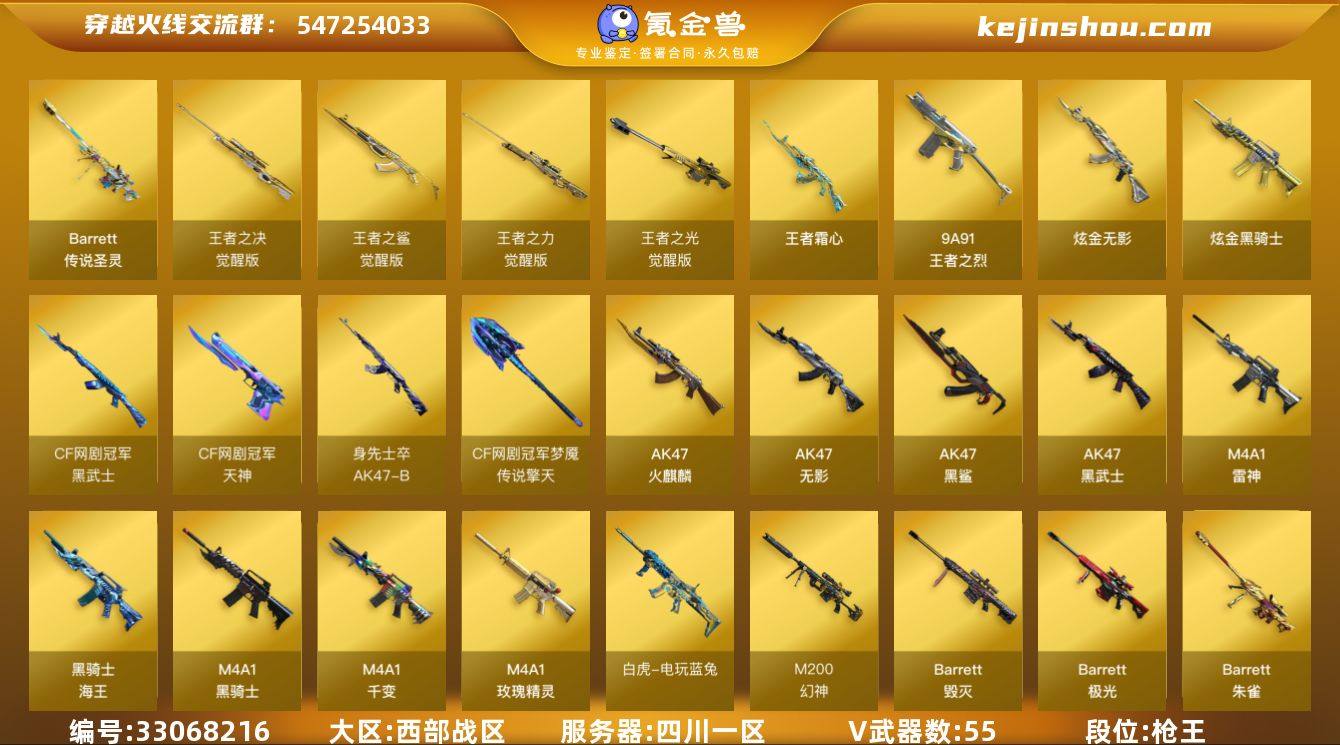 四川一区-59V-6王者武器数-2炫金武器数 【传说武器】:传说圣灵 【热门武器】:传说圣灵,QBZ03-金色蔷薇,M4A1-青龙,M200-幻神,白虎-电玩蓝兔,Kar98K-星神,M4A1-黑骑士,汤姆逊-烈龙*3,加特林-炼狱,沙鹰-修罗*2,金刚伞 【王者炫金武器】:王者之烈,王者霜心,炫金骑士,炫金无影 【音效卡】:AK47-火麒麟音效卡,M4A1-黑骑士音效卡*2,绝迹语音包,白鲨语音包 【皮肤】:M200-幻神-黄忠皮肤,雷神-虎将,火麒麟-轻羽皮肤,火麒麟-战神关羽,毁灭-战神张飞,毁灭-黑大圣皮肤,毁灭-英雄计划 皮肤,黑骑士-战神马超,无影-能量核心,玫瑰精灵-蓝调梦幻 皮肤,战神-粉色甜心皮肤,战神-紫绶金章皮肤,AK47-B-常胜将军-曹操,AK47-B-常胜将军-孙权,天龙-能量核心 【角色】:王者涂鸦,暗夜-X,北极狐-X,风暴女,虎妞,兰-海滩派对,猎狐者-追月,0号玩家,灵狐者-七夕宝贝,麻雀,曼陀罗-X,潘多拉-X,潘多拉-甜心教官,青霞仙子,甜心偶像,蜀雪,王者-零-传说之路,职业选手 【人偶武器】:M4A1-雷神-精英刀锋,迷你深渊冰龙,夺魂,深渊终结者手雷*2,闪光弹-小乔,闪光弹-貂蝉,高爆手雷-大乔,迷你艾比,迷你超能女侍 【暴走生化】:超级对讲机 【挑战大师】:神...
