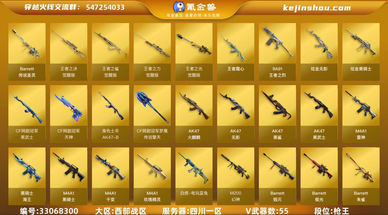 【ky6789】四川一区-59V-6王者武器数-2炫金武器数 【传说武器】:传说圣灵 【热门武器】:传说圣灵,QBZ03-金色蔷薇,M4A1-青龙,M200-幻神,白虎-电玩蓝兔,Kar98K-星神,M4A1-黑骑士,汤姆逊-烈龙*3,加特林-炼狱,沙鹰-修罗*2,金刚伞 【王者炫金武器】:王者之烈,王者霜心,炫金骑士,炫金无影 【音效卡】:AK47-火麒麟音效卡,M4A1-黑骑士音效卡*2,绝迹语音包,白鲨语音包 【皮肤】:M200-幻神-黄忠皮肤,雷神-虎将,火麒麟-轻羽皮肤,火麒麟-战神关羽,毁灭-战神张飞,毁灭-黑大圣皮肤,毁灭-英雄计划 皮肤,黑骑士-战神马超,无影-能量核心,玫瑰精灵-蓝调梦幻 皮肤,战神-粉色甜心皮肤,战神-紫绶金章皮肤,AK47-B-常胜将军-曹操,AK47-B-常胜将军-孙权,天龙-能量核心 【角色】:王者涂鸦,暗夜-X,北极狐-X,风暴女,虎妞,兰-海滩派对,猎狐者-追月,0号玩家,灵狐者-七夕宝贝,麻雀,曼陀罗-X,潘多拉-X,潘多拉-甜心教官,青霞仙子,甜心偶像,蜀雪,王者-零-传说之路,职业选手 【人偶武器】:M4A1-雷神-精英刀锋,迷你深渊冰龙,夺魂,深渊终结者手雷*2,闪光弹-小乔,闪光弹-貂蝉,高爆手雷-大乔,迷你艾比,迷你超能女侍 【暴走生化】:超级对讲机 【挑战...