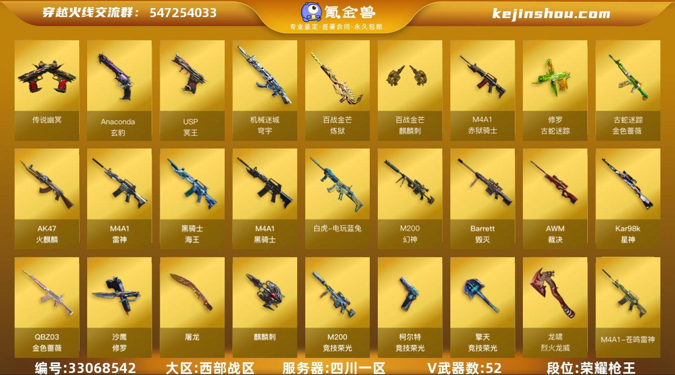 【ky6784】四川一区-60V-4王者武器数-0炫金武器数 【传说武器】:传说幽冥 【热门武器】:传说幽冥,QBZ03-金色蔷薇,M200-幻神,金色蔷薇-古蛇迷踪,修罗-古蛇迷踪,M200-竞技荣光,白虎-电玩蓝兔,Kar98K-星神,M4A1-黑骑士,沙鹰-修罗 【王者炫金武器】:王者冰锋,高爆手雷-雷霆王者 【音效卡】:屠龙-电竞之星-竞星跃动音效卡,M4A1-黑骑士音效卡,AWM-裁决音效卡,HK417-朱雀-电竞之星-竞星跃动音效卡,Barrett-碧霄极光音效卡,炼狱-百战金芒-庆典舞曲音效卡 【皮肤】:星神-璀璨皮肤,裁决-叶芒苍灵 皮肤,M4A1-再燃火线,雷神-神秘按键 皮肤,火麒麟-心动糖果,黑龙-能量核心,黑骑士-冠军之势,黑骑士-CFS2021,AWM-再燃火线,屠龙-星耀 皮肤,屠龙-破浪逐光 皮肤,轻型军用手斧-再燃火线 【角色】:雨棠,电竞教官-云悠悠,关小雨,晴雅,星际战将,审判者,零·纪元,战地猎狐,蛇隐宗,云海玲珑,葵-阿尔法武装,幻面灵狐,暗夜-X,北极狐-X,芳心审判者,风暴女,嘉年华灵狐,娟娟,0号玩家,灵狐-花神,灵狐者-X,麻雀,曼陀罗-礼服,潘多拉-X,潘多拉-甜心教官,青霞仙子,蛇姬,斯沃特-X,铁骑荣耀,兔囡囡,维纳斯,夜玫瑰-宠粉,影武者-X,潘多拉-N 【人偶...