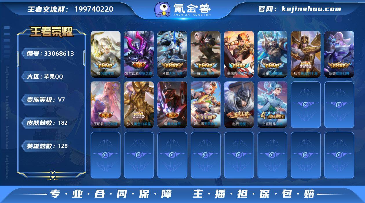 苹果Q 可二次 金标程咬金 13传说128英雄182皮肤 祥瑞亨通 山海炽霜斩 绛天战甲 乞巧织情 音你心动女 无双飞将 怒海麟威 炽阳神光 云鹰飞将 猫影幻舞 黄金射手座 黄金白羊座 地狱之眼 谪仙醉月 山海玄木吟 龙胆 拒霜思 冰冠公主 梁祝 糖绘人间 百解令 雪夜绮愿 电玩爆裂旋风 无限星赏官 原初探秘者 水晶猎龙者 金属风暴 热力回旋 曙光守护者 特工战影 黄金分割率 妄想食味 逐浪之夏 魅语 幽灵船长 乘风破浪 永昼 时之恋人女 偶像歌手 街头霸王 摇滚巨星 鬼剑武藏 冰雪圆舞曲 顽趣梦奇 王者荣耀账号