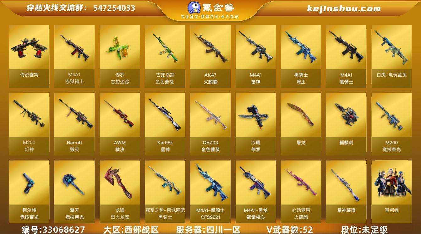 四川一区-60V-4王者武器数-0炫金武器数 【传说武器】:传说幽冥 【热门武器】:传说幽冥,QBZ03-金色蔷薇,M200-幻神,金色蔷薇-古蛇迷踪,修罗-古蛇迷踪,M200-竞技荣光,白虎-电玩蓝兔,Kar98K-星神,M4A1-黑骑士,沙鹰-修罗 【王者炫金武器】:王者冰锋,高爆手雷-雷霆王者 【音效卡】:屠龙-电竞之星-竞星跃动音效卡,M4A1-黑骑士音效卡,AWM-裁决音效卡,HK417-朱雀-电竞之星-竞星跃动音效卡,Barrett-碧霄极光音效卡,炼狱-百战金芒-庆典舞曲音效卡 【皮肤】:星神-璀璨皮肤,裁决-叶芒苍灵 皮肤,M4A1-再燃火线,雷神-神秘按键 皮肤,火麒麟-心动糖果,黑龙-能量核心,黑骑士-冠军之势,黑骑士-CFS2021,AWM-再燃火线,屠龙-星耀 皮肤,屠龙-破浪逐光 皮肤,轻型军用手斧-再燃火线 【角色】:雨棠,电竞教官-云悠悠,关小雨,晴雅,星际战将,审判者,零·纪元,战地猎狐,蛇隐宗,云海玲珑,葵-阿尔法武装,幻面灵狐,暗夜-X,北极狐-X,芳心审判者,风暴女,嘉年华灵狐,娟娟,0号玩家,灵狐-花神,灵狐者-X,麻雀,曼陀罗-礼服,潘多拉-X,潘多拉-甜心教官,青霞仙子,蛇姬,斯沃特-X,铁骑荣耀,兔囡囡,维纳斯,夜玫瑰-宠粉,影武者-X,潘多拉-N 【人偶武器】:迷...