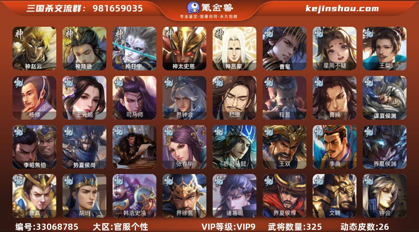 神赵云,神陆逊,神甘宁,神太史慈,曹髦,星周不疑,王粲,杨修,王元姬,司马师,界钟会,嵇康,曹纯,程昱,马云騄,谋赵云,赵襄,张星彩,王平,沙摩柯,谯周,花鬘,周处,吴景,骆统,界朱然,界徐盛,势陆郁生,势太史慈,左慈,张让,星黄忠,麹义,南华老仙,谋张角,兀突骨,司马昭,神吕蒙,势夏侯尚,SP关羽,SP蔡文姬,乐进,曹昂,诸葛诞,朱灵,文聘,SP姜维,张春华,钟会,曹冲,郭淮,满宠,界王异,界曹操,界司马懿,界夏侯惇,界张辽,界郭嘉,李典,曹真,韩浩史涣,陈群,曹叡,钟繇,司马朗,王基,李通,郭皇后,界甄姬,吕虔,鲁芝,界徐晃,杜畿,界曹丕,界邓艾,界曹植,界满宠,界郭淮,卞夫人,蔡贞姬,袁涣,王双,崔琰,毛玠,曹嵩,谋于禁,谋荀彧,牵招,胡班,李昭焦伯,司马孚,谋夏侯渊,界夏侯渊,唐咨,势陈到,SP孙尚香,关银屏,夏侯霸,马良,关兴张苞,廖化,界马岱,关平,简雍,刘封,界法正,界关兴张苞,界刘备,界关羽,界张飞,界赵云,界马超,SP徐庶,吴懿,周仓,张松,刘谌,夏侯氏,糜竺,马忠,李严,黄皓,赵统赵广,界伊籍,界庞统,吕凯,张翼,杨仪,傅肜,...