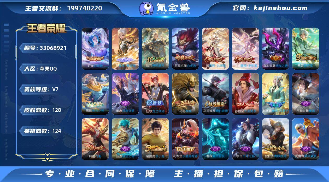 苹果Q-V7-尊贵铂金II段位-124英雄-128皮肤-1典藏皮肤-1无双-6传说-33史诗 【荣耀典藏】:貂蝉幻阙歌 【无双皮肤】:曜器灵螭龙剑 【传说皮肤】:后羿神树通天,澜愿照九州拓,虞姬愿照岁时盈,桑启鸣野蒿,百里玄策白虎志,宫本武藏地狱之眼 【限定皮肤】:狄仁杰阴阳师,赵云皇家上将,阿轲迷踪丽影,吕布猎兽之王,马可波罗暗影游猎,狄仁杰魔术师,狄仁杰万华元夜,达摩沙漠行僧,项羽海滩派对,老夫子醍醐杖,刘邦夺宝奇兵,韩信飞衡,孙悟空大圣娶亲,李元芳银河之约,李元芳云中旅人,钟馗驱傩正仪,雅典娜单词大作战,鬼谷子原初探秘者,百里玄策白虎志,弈星混沌棋,沈梦溪星空之诺,明世隐疑决卦,裴擒虎李小龙,猪八戒西部大镖客,蒙犽狂想玩偶喵,沈梦溪龙舞盛年 【年限皮肤】:百里玄策白虎志,韩信飞衡,澜愿照九州拓,虞姬愿照岁时盈 【赛季限定】:弈星混沌棋,明世隐疑决卦,老夫子醍醐杖,鬼谷子原初探秘者,狄仁杰万华元夜,钟馗驱傩正仪,达摩沙漠行僧,李元芳云中旅人,东皇太一噬灭天穹,太乙真人谧流熔炉,甄姬逆浪荇歌,亚瑟荣光之誓 【战令限定】:吕布猎兽之王,李元芳银河之约,沈梦溪星空之诺,阿轲迷踪丽影,刘邦夺宝奇兵,马可波罗暗影游猎,猪...