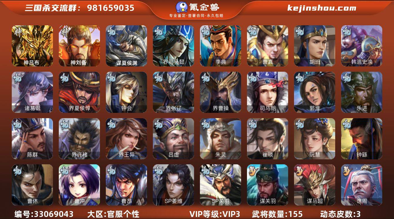 官阶:先锋将军;VIP等级:VIP3;史诗武将数量:8;动态皮肤数量:3;武将总数:155;史诗宝珠数量:0;将魂数量:1006;神将:2;魏国史诗武将:2;蜀国史诗武将:3;吴国史诗武将:0;群史诗武将:3 神吕布,神刘备,谋马超,谯周,谋关羽,庞德公,杜预,势于吉,SP关羽,乐进,曹昂,诸葛诞,朱灵,SP姜维,钟会,曹冲,郭淮,界王异,界曹操,界司马懿,界夏侯惇,界张辽,界许褚,李典,曹真,韩浩史涣,陈群,曹休,钟繇,司马朗,吕虔,崔琰,阮慧,胡班,谋夏侯渊,夏侯霸,马良,关兴张苞,廖化,界马岱,关平,简雍,刘封,界法正,界刘备,界赵云,SP徐庶,吴懿,周仓,张松,刘谌,夏侯氏,彭羕,诸葛瑾,孙鲁育,程普,韩当,潘璋马忠,虞翻,朱然,界甘宁,界黄盖,界周瑜,界大乔,界陆逊,孙鲁班,顾雍,朱治,全琮,界孙权,潘濬,孙邵,陈武董袭,界朱治,张布,伏完,刘协,界袁术,张宝,伏皇后,李儒,华雄,袁术,界华佗,界吕布,公孙瓒,蔡夫人,公孙渊,蹋顿,SP黄月英,界貂蝉,界庞德,刘繇,界公孙瓒,韩遂,贾充,张任,SP蔡文姬-兔年冬日(动态),关羽-以身证道(动态),周瑜-蛇年端午(动态),陶谦-安民护祚(动态)