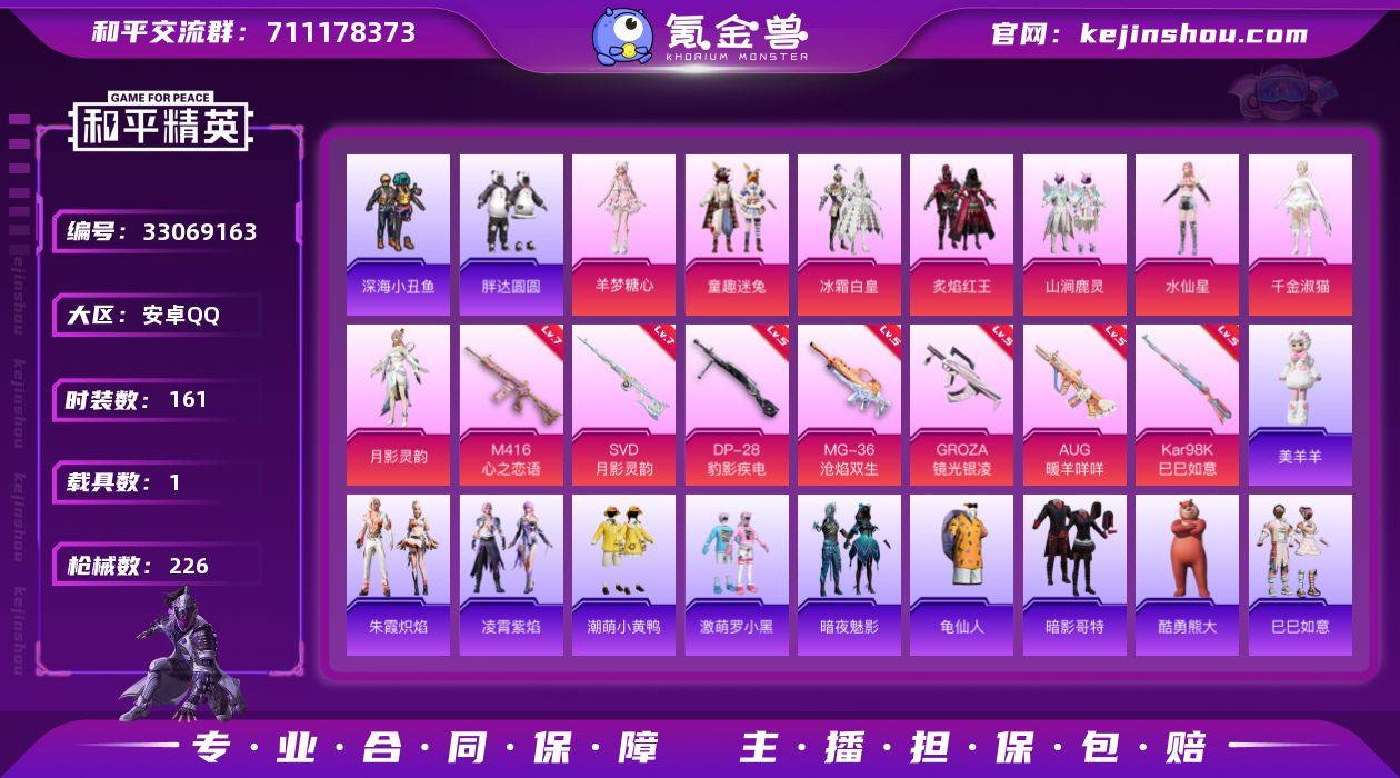 安卓 手Q-14粉装-15特效枪-1载具-5粉色飞行器-76833热力值-17王牌印记-161套装-226枪皮 【热门品类】:粉装-童趣迷兔,套装-深海小丑鱼,套装-胖达圆圆,套装-龟仙人,套装-潮萌小黄鸭,套装-暗影哥特 【粉色套装】:粉装-冰霜白皇,粉装-童趣迷兔,粉装-炙焰红王,粉装-山涧鹿灵,角色-水仙星,角色-千金淑猫,角色-月影灵韵,角色-羊梦糖心,角色-花中眠,人物-小舞,人物-小舞·灵珑,人物-小舞·恋语,角色-蜜语粉晶,角色-极地冰晶 【粉色枪皮等级】:SCAR-L-灵驹仙姬(三级),M416-心之恋语(七级),GROZA-镜光银凌(五级),AUG-暖羊咩咩(五级),ACE32-萌骑漫游(四级),UMP45-萌骑冒险(一级),AKS-74U-森灵之息(四级),Kar98K-巳巳如意(五级),AWM-谜鸦审判(五级),Mk14-福马献瑞(五级),SVD-月影灵韵(七级),AA12-G-萌骑幻想(一级),DP-28-豹影疾电(五级),PKM-萌骑夺宝(二级),MG-36-沧焰双生(五级) 【粉色载具】:僚机-圣域龙宝,九霄玄鹿 【粉色枪皮】:SCAR-L-灵驹仙姬,M416-心之恋语,GROZA-镜光银凌,AUG-暖羊咩咩,ACE32-萌骑漫游,UMP45-萌骑冒险,AKS-74U-森灵之息,Kar98K-巳巳如意,AWM-谜鸦审判,Mk14-福马献瑞,SVD-月影灵韵,AA12-G-萌骑幻想,DP-28-豹影疾...