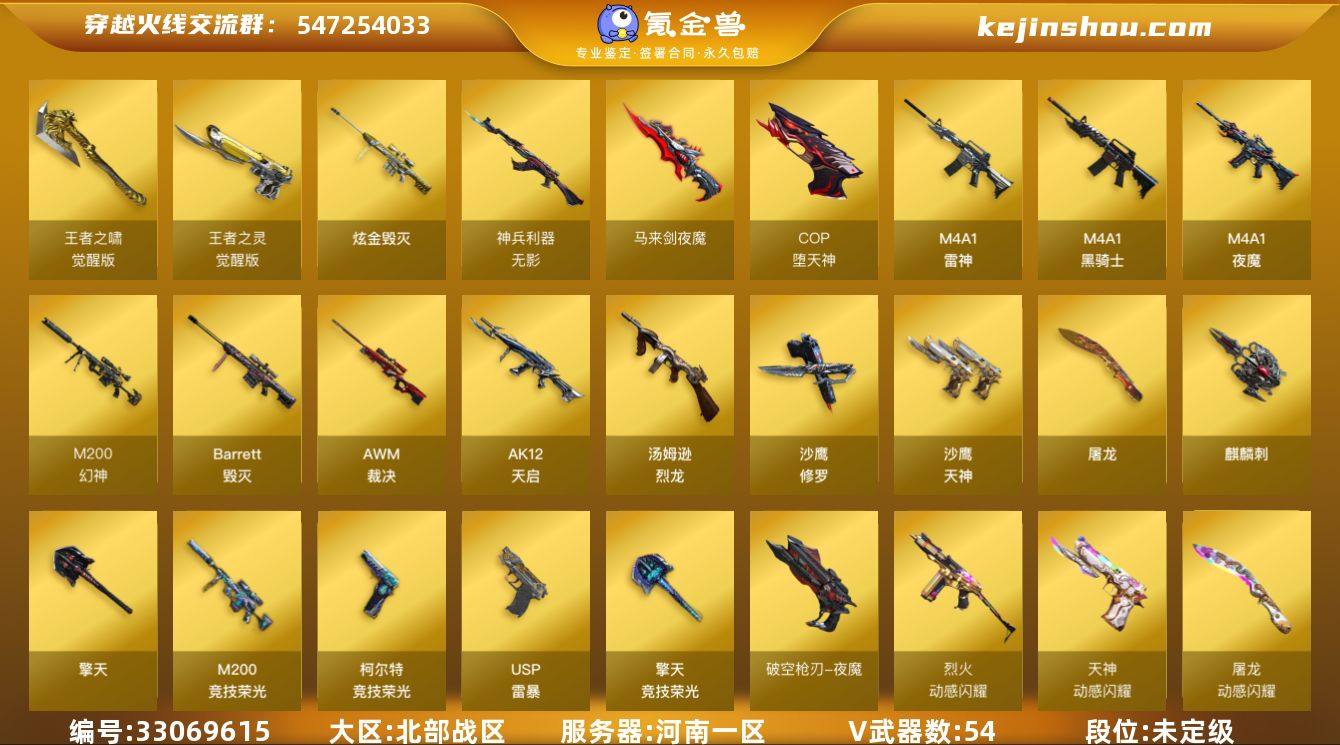 河南一区-59V-3王者武器数-1炫金武器数 【热门武器】:M200-幻神,M200-竞技荣光,死亡之眼,M4A1-黑骑士,汤姆逊-烈龙*6,USP-雷暴,COP-堕天神,沙鹰-修罗 【王者炫金武器】:炫金毁灭 【音效卡】:绝迹语音包 【皮肤】:幻神-电流骇客 皮肤,雷神-荣耀之魄,雷神-宠儿-2019MVP,毁灭-荣耀之怒,毁灭-BEAN-2020MVP,毁灭-神秘黑洞皮肤,修罗-冠军之魂,屠龙-荣耀之锋 【角色】:葵,电竞教官-云悠悠,王者玲珑,乔伊教练,云海玲珑,电竞少女,嘉年华灵狐,娟娟,灵狐者-黄金海岸,邱刚敖,青霞仙子,雪莉杨,雪莉杨-摸金校尉,影武者-X,职业选手,雅典娜 【人偶武器】:AWM-灵狐-15周年嘉年华,M37-葵,迷你裂空之翼,迷你波特博士*2,夺魂,迷你火种 【暴走生化】:死亡之眼 【挑战大师】:冰龙粉碎者-白马银枪,激光毁灭者III-白马银枪,神圣爆裂者-末日III 【英雄级武器】:M4A1-雷神,M4A1-黑骑士,AK12-天启*2,M4A1-夜魔,无影-神兵利器,烈火-动感闪耀,王者之魄-觉醒版,Barrett-毁灭,AWM-裁决,M200-幻神,M200-竞技荣光,汤姆逊-烈龙*6,沙鹰-修罗,沙鹰-天神,USP-雷暴,COP-堕天神,柯尔特-竞技荣光,破空枪刃-夜魔,王者之灵-觉醒版,天神-动感闪耀,屠龙,...