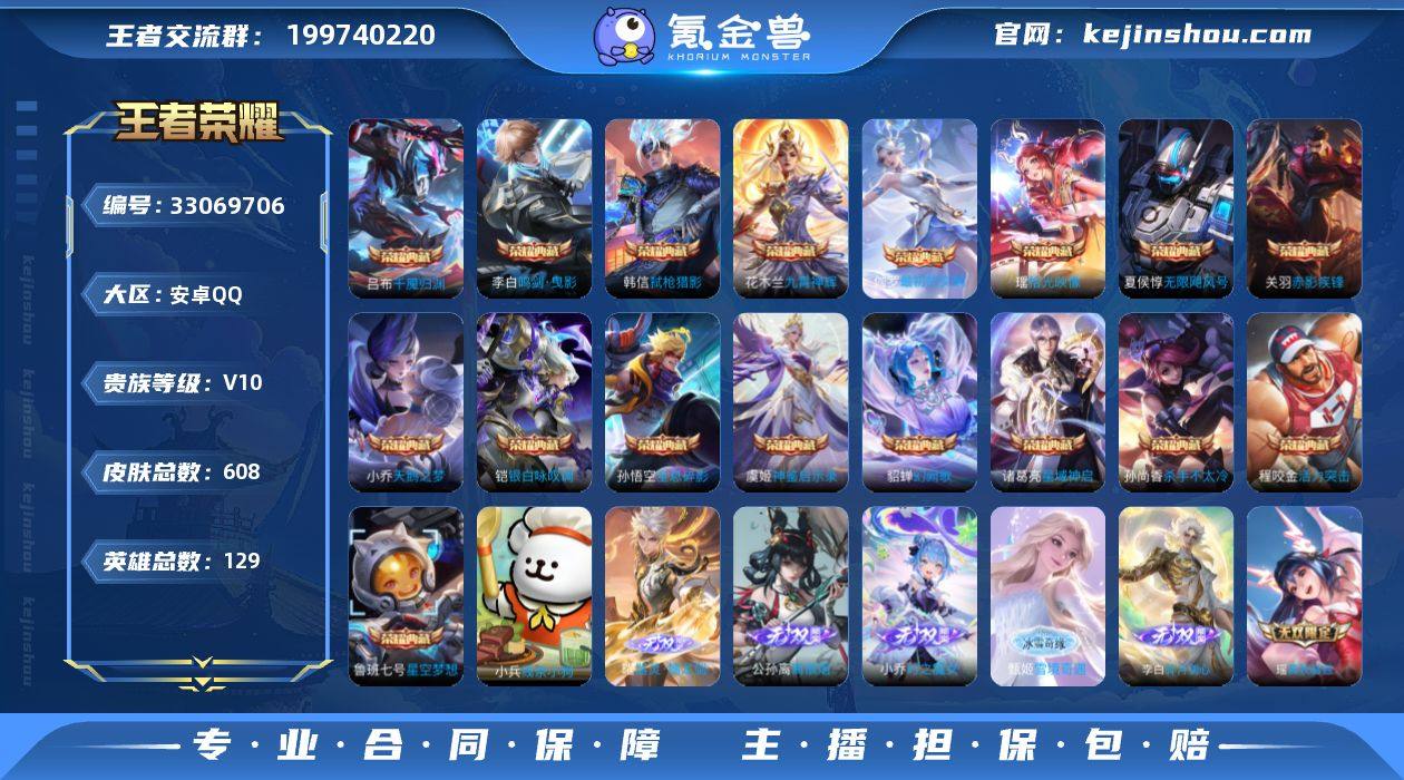 V10 17典藏 8无双 5珍品 106传说 5星元 608皮肤 129英雄 【17水晶】关羽-赤影疾锋,花木兰-九霄神辉,程咬金-活力突击,李白-鸣剑·曳影,鲁班七号-星空梦想,孙尚香-杀手不太冷,孙悟空-全息碎影,夏侯惇-无限飓风号,小乔-天鹅之梦,诸葛亮-星域神启,貂蝉-幻阙歌,铠-银白咏叹调,韩信-弑枪猎影,虞姬-神鉴启示录,瑶-拾光映像,伽罗-最初的交响,吕布-千魇归渊【8无双】瑶-真我赫兹,李白-碎月剑心,小乔-时之魔女,韩信-群星魔术团,公孙离-离恨烟,甄姬-雪境奇遇,曜-器灵·螭龙剑【5珍品传说】马可波罗-怪盗基德,嫦娥-器灵·落星盏,张飞-兔狲·蓬尾,安琪拉-酷洛米之心,瑶-大耳狗之梦【106传说】虞姬-无限倾心,小乔-山海·琳琅生,李白-诗剑行,狄仁杰-神器·狴犴令,不知火舞-绯月行,百里守约-碎云,橘右京-枫霜尽,娜可露露-前尘镜,孙尚香-音你闪耀,马可波罗-深海之息,后羿-无尽星芒,马超-无双飞将,大乔-挚爱花嫁,蔡文姬-花朝如约,百里玄策-白虎志,达摩-黄金狮子座,狄仁杰-超时空战士,貂蝉-仲夏夜之梦,貂蝉-猫影幻舞,伽罗-太华,干将莫邪-久胜战神,公孙离-祈雪灵祝,宫本武藏-地狱之眼,后羿-黄金射手座,花木兰-冠军飞将,镜-炽阳神光,铠-绛天战甲,李信-一念神魔,李元芳-飞鸢探春,刘备-时之恋人,鲁班七号-寅...