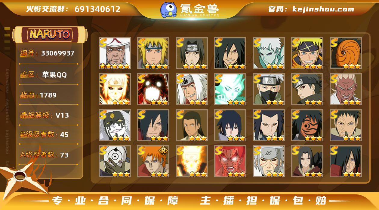 【2731】V13 1789万战力 45S-73A 点卷2032 组织3 有1侠隐奥义图 有熊猫 仙人自来也51片 烈斗80片 四代目雷影78片 LL6017 【S级忍者】:长门「秽土转生」(3星),三代目风影「秽土转生」(3星),半藏「秽土转生」(3星),猿飞日斩「秽土转生」(3星),波风水门「秽土转生」(3星),千手扉间「秽土转生」(3星),千手柱间「秽土转生」(3星),宇智波鼬「秽土转生」(3星),宇智波斑「秽土转生」(3星),宇智波斑「秽土转生·解」(3星),春野樱「忍界大战」(3星),宇智波带土「忍界大战」(3星),艾「忍界大战」(3星),宇智波鼬「须佐能乎」(4星),宇智波止水「须佐能乎」(3星),旗木卡卡西「须佐能乎」(3星),宇智波斑「木叶创立」(3星),千手柱间「木叶创立」(3星),自来也(3星),自来也「舞之豪杰」(3星),大蛇丸(3星),自来也「传说中的三忍」(3星),纲手(3星),纲手「百豪」(3星),千手扉间(3星),猿飞日斩(5星),宇智波斑(3星),波风水门(4星),神秘面具男(3星),神秘面具男「红夜之刃」(3星),漩涡鸣人「九喇嘛连结」(3星),迈特凯「死门」(3星),佩恩「天道」(3星),佩恩·天道「超」(3星),宇智波佐助「永恒万花筒」(3星),宇智波斑 「白面具」(3星宇智波斑「白面具」),大筒木金式(...