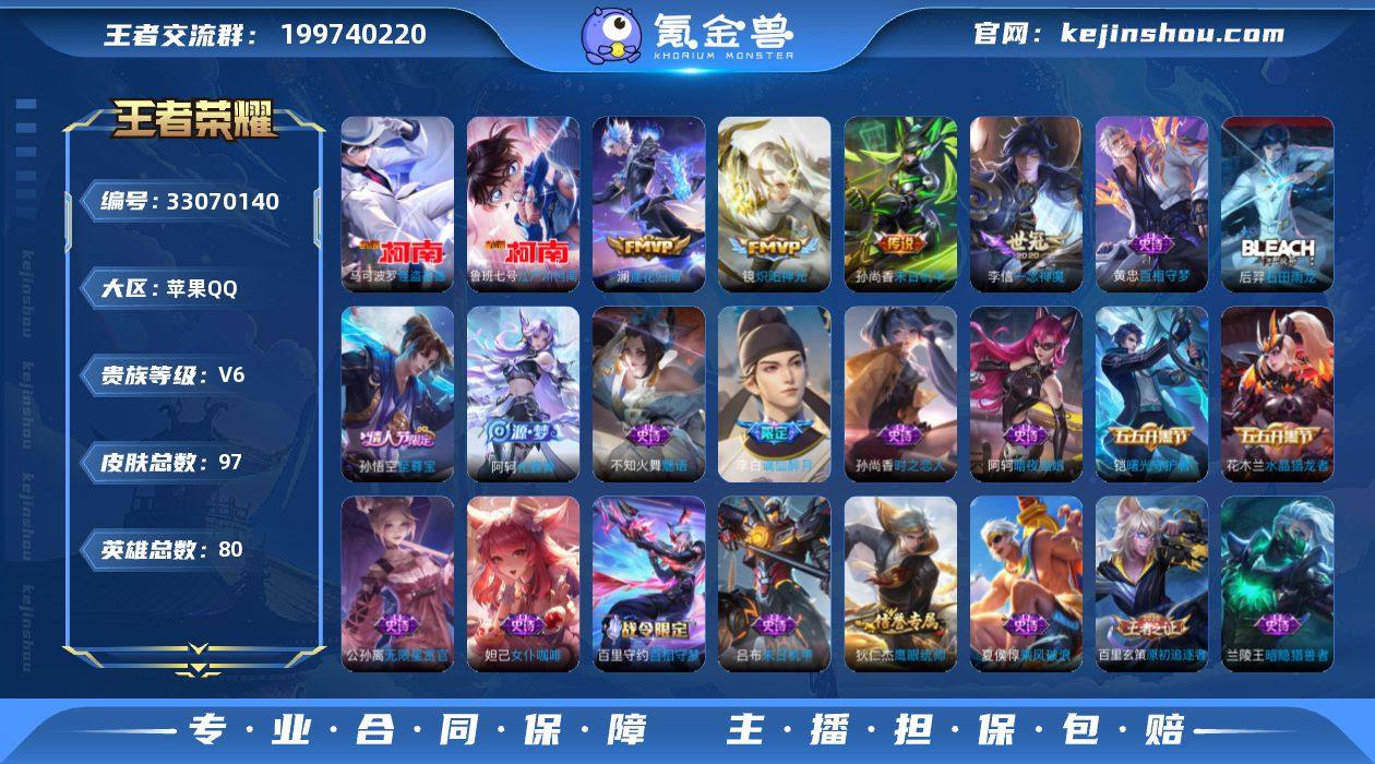 【店长精选双珍品·江户川柯南·怪盗基德·愿照九州拓·逐花归海·炽阳神光·无二次包过】w22748-苹果Q-80英雄-97皮肤-5王者印记-95铭文-贵族积分1w【贵族6】【2珍品·7传说·4按键·205幸运值】【因赛季更新游戏段付以上号为准!】 【珍品传说】:鲁班七号江户川柯南,马可波罗怪盗基德 【传说皮肤】:澜愿照九州拓,桑启鸣野蒿,澜逐花归海,李白诗剑行,镜炽阳神光,李信一念神魔,孙尚香末日机甲 【限定皮肤】:姜子牙天穹之誓,李白谪仙醉月,狄仁杰阴阳师,赵云皇家上将,狄仁杰魔术师,项羽海滩派对,孙悟空至尊宝,百里玄策原初追逐者,沈梦溪龙舞盛年,周瑜熔金海岸 【年限皮肤】:澜愿照九州拓 【赛季限定】:姜子牙天穹之誓,东皇太一噬灭天穹,太乙真人谧流熔炉,钟馗虚灵犬护,甄姬逆浪荇歌,百里玄策原初追逐者 【战令限定】:百里守约百相守梦,老夫子百相守梦,孙膑茶境仙,马超访茗客,周瑜线条小狗 【史诗皮肤】:周瑜线条小狗,公孙离涂山容容,黄忠百相守梦,后羿石田雨龙,阿轲化蝶舞,孙膑茶境仙,百里守约百相守梦,李白谪仙醉月,貂蝉唤灵魅影,百里玄策热力回旋,百里玄策原初追逐者,孙尚香时之恋人,不知火舞魅语,公孙离无限星赏官,狄仁杰鹰眼统帅,伽罗箭...