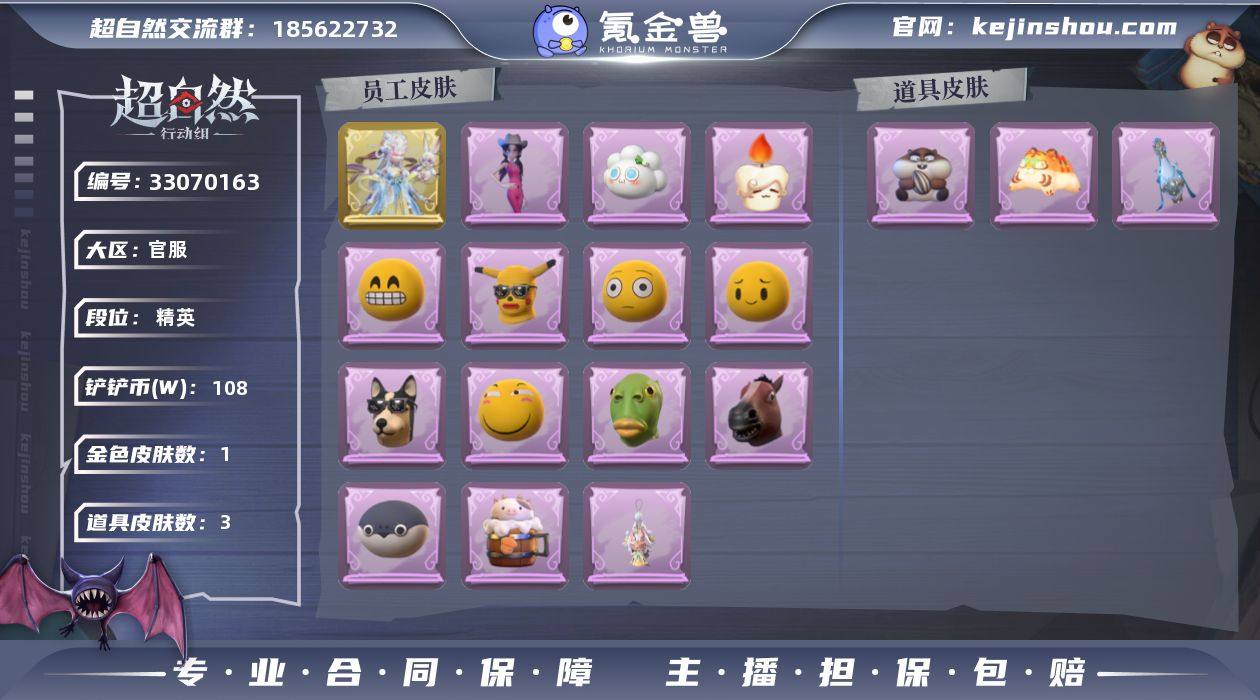 金皮1;紫皮1;道具皮3;皮肤:莉莉-瑶台梦,爱丽丝-耀眼的你;道具:急救包-土拨鼠捏捏,腰包-红运福虎,黄牛能量饮料-青玉抱丹;饰品:头饰-哈士奇头套,头饰-滑稽头套,头饰-呆滞头套,头饰-面具马头套,头饰-嘻嘻头套,头饰-萨卡班甲鱼头套,头饰-鱼头怪头套,头饰-腊肠扭扭,头饰-卑微头套,头饰-饺饺者头套,头饰-烛光纪念,头饰-烈焰红唇头套,头饰-像素朋克墨镜,头饰-后室幸存者头套,挂饰-拂云仙,背饰-牛啤背包;动作:动作-孤身摇,动作-新年摇,动作-舞台中心,动作-金城舞,动作-举牌,动作-抬手;工牌背景:工牌背景-粉嫩小海狸,工牌背景-甜心的囚笼,工牌背景-心同野鹤;工牌动作:工牌动作-蜕变,工牌动作-净禅;员工:薇薇安,巫铃儿,零,莉莉,小黄,兰,爱丽丝;累充132元;铲铲币10.8万;金砖2;段位:精英Ⅰ;魔盒等级:62 【账号已绑定信息】:密保手机,邮箱