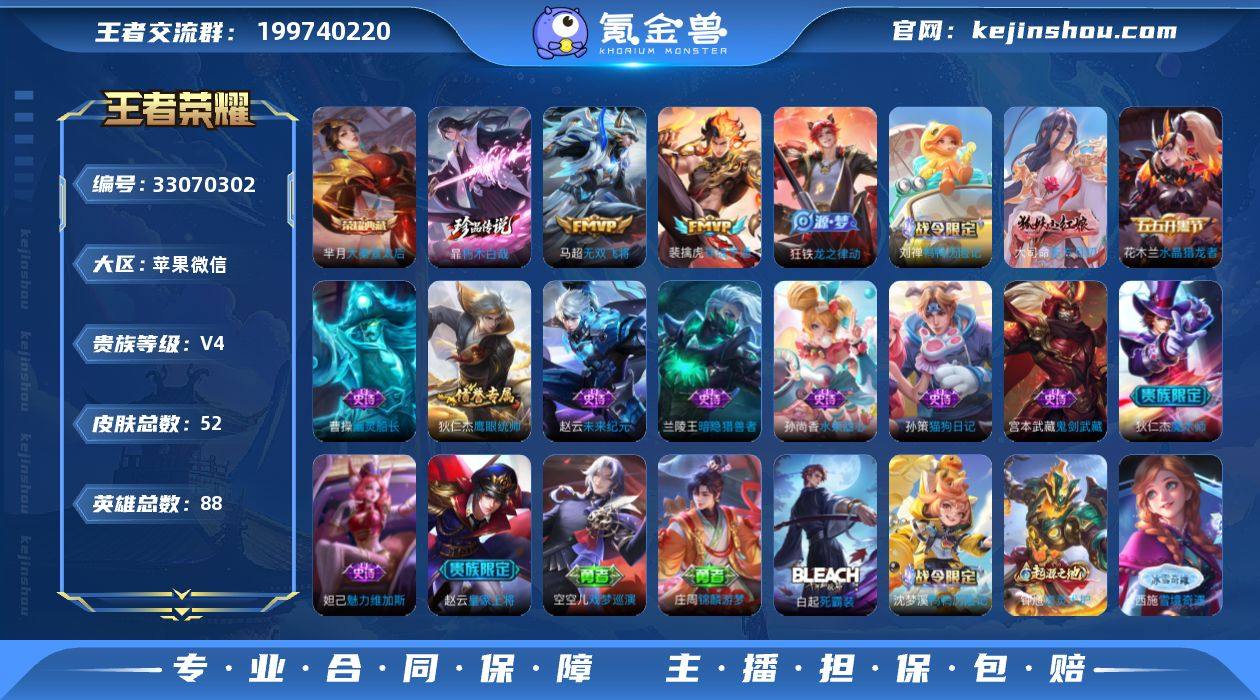 微信区极品数据号,历史国服老虎曹操兰陵王霏➕小国服马超高胜率高评分细节图上苹果微信/至尊星耀/52皮肤/88英雄/1典藏/0珍品无双/0无双/1珍品传说/2传说/14史诗/2稀有英雄
