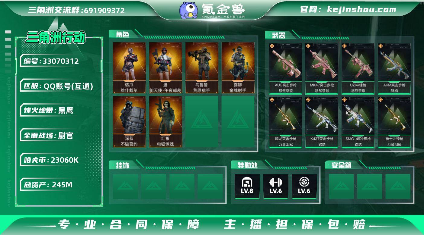 【SJZQH1604】总资产(M):245M/哈夫币(K):23060K/哈夫币(K):23060K/传说枪皮数:30/全面战场等级:33_段位:尉官/烽火地带等级:60_段位:黑鹰/蛊-能天使·午夜邮差/骇爪-维什戴尔/深蓝-不破誓约(S6)/红狼-电锯惊魂/露娜-金牌射手(S7)/乌鲁鲁-荒原猎手/近战-黑鹰/M4A1突击步枪-阿米娅/AKM突击步枪-锦绣/M16A4突击步枪-狩猎时刻/AUG突击步枪-悠然茶歇/SG552突击步枪-运动员/AK-12突击步枪-特斯拉线圈/SCAR-H战斗步枪-启航/G3战斗步枪-狩猎时刻/G3战斗步枪-骑士/CAR-15突击步枪-阿米娅/腾龙突击步枪-万金泪冠/K437突击步枪-锦绣/KC17突击步枪-电锯惊魂/MK47突击步枪-悠然茶歇/Vector冲锋枪-狩猎时刻/Vector冲锋枪-能天使-午夜邮差/UZI冲锋枪-特斯拉线圈/UZI冲锋枪-悠然茶歇/SMG-45冲锋枪-锦绣/SR-3M紧凑突击步枪-特斯拉线圈/勇士冲锋枪-能天使-午夜邮差/勇士冲锋枪-万金泪冠/M250通用机枪-骑士之心/M14射手步枪-蛮荒/M14射手步枪-缄花/SKS射手步枪-骑士/SR-25射手步枪-缄花/R93狙击步枪-维什戴尔/AWM狙击步枪-万金泪冠/.357左轮-缄花/ASh-12战斗步枪-无极限/K416突击步枪-冬日风情/K416突击步枪-腊梅/K416突击步枪-阿萨拉特攻/M7战斗步枪-百步穿杨/G3战斗步枪-流沙送葬/AS Val...