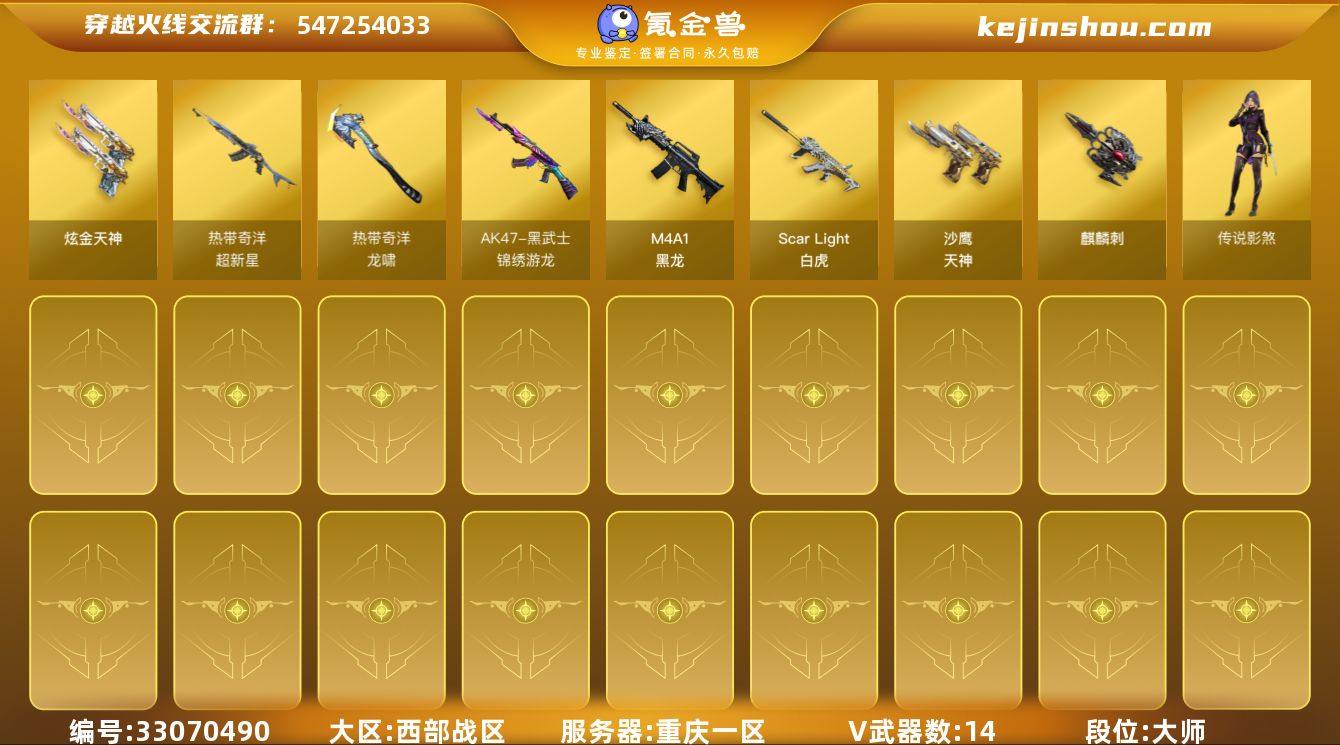 【ky6277】重庆一区-12V-0王者武器数-1炫金武器数 【传说角色】:传说影煞 【热门武器】:Scar Light-白虎,金色小号,Cat-刀锋,MK5-炽火炎龙 【王者炫金武器】:炫金天神 【音效卡】:AK47-火麒麟音效卡 【角色】:奇洋探员,斗烈龙骑,飞虎队-X,风暴女,荆棘玫瑰,潜龙队-X,甜心偶像,兔囡囡,夜玫瑰-幻能朋克,团团 【人偶武器】:MK5-炽火炎龙,迷你律动酷熊,Cat-刀锋,迷你深渊冰龙 【暴走生化】:超级对讲机 【挑战大师】:AK47-冰龙粉碎者,试炼破坏者III 【英雄级武器】:M4A1-黑龙,Scar Light-白虎,黑武士-锦绣游龙,超新星-热带奇洋,天罚-斗烈龙驹,Barrett-金色蔷薇,沙鹰-天神,麒麟刺,龙啸-热带奇洋,屠龙-斗烈龙驹,高爆手雷-云龙*2,手雷-热带奇洋,闪光弹-云龙 【其他武器】:源·雷神,源·黑骑士,魂·黑骑士-幻能朋克,魂·黑骑士-娜塔莉娅,源·AK47-黑武士,源·武圣,M4A1-青龙-掌上穿越火线,魂·HK417-朱雀-凤灵,白虎-九尾白狐,魂·裁决-神秘按键,源·毁灭,源·Barrett-朱雀,魂·炼狱-月*2,魂·天神-宇航兔兔,源·武圣glock,魂·擎天-破浪10年 【道具】:奇洋探员-海龟背包,热带奇洋炫彩背包,超级背包,绿色巨人,灵魂忍者*2,变异宝贝,迷雾幽灵...