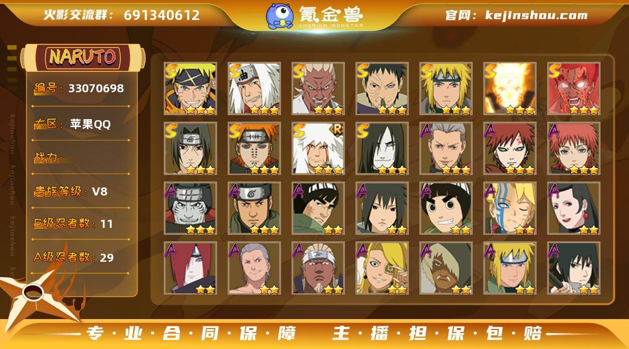 账号亮点:宇智波带土「忍界大战」(3星),艾「忍界大战」(3星),宇智波鼬「须佐能乎」(3星),自来也「舞之豪杰」(3星),大蛇丸(3星),自来也「传说中的三忍」(3星),波风水门(3星),漩涡鸣人「九喇嘛连结」(3星),迈特凯「死门」(3星),佩恩「天道」(3星),漩涡鸣人·宇智波佐助(3星)199-75 【S级忍者】:宇智波带土「忍界大战」(3星),艾「忍界大战」(3星),宇智波鼬「须佐能乎」(3星),自来也「舞之豪杰」(3星),大蛇丸(3星),自来也「传说中的三忍」(3星),波风水门(3星),漩涡鸣人「九喇嘛连结」(3星),迈特凯「死门」(3星),佩恩「天道」(3星),漩涡鸣人·宇智波佐助(3星) 【A级忍者】:艾「青年」(2星),长门「青年」(2星),波风水门「青年」(2星),达鲁伊「博人传」(2星),迪达拉(2星),迪达拉「新春限定」(2星),奇拉比(2星),飞段(3星),飞段「死司凭血」(2星),飞段「晓创生」(2星),干柿鬼鲛(3星),漩涡博人「桃式显现」(2星),漩涡鸣人「九尾查克拉」(2星),迈特凯(2星),旗木卡卡西「万花筒写轮眼」(2星),我爱罗「疾风传」(3星),蝎(3星),小南「神驹佑将」(2星),猿飞阿斯玛(3星),宇智波鼬(2星),宇智波佐助「须佐能乎」(2星),宇智波佐助「疾风传咒印」(2星),...
