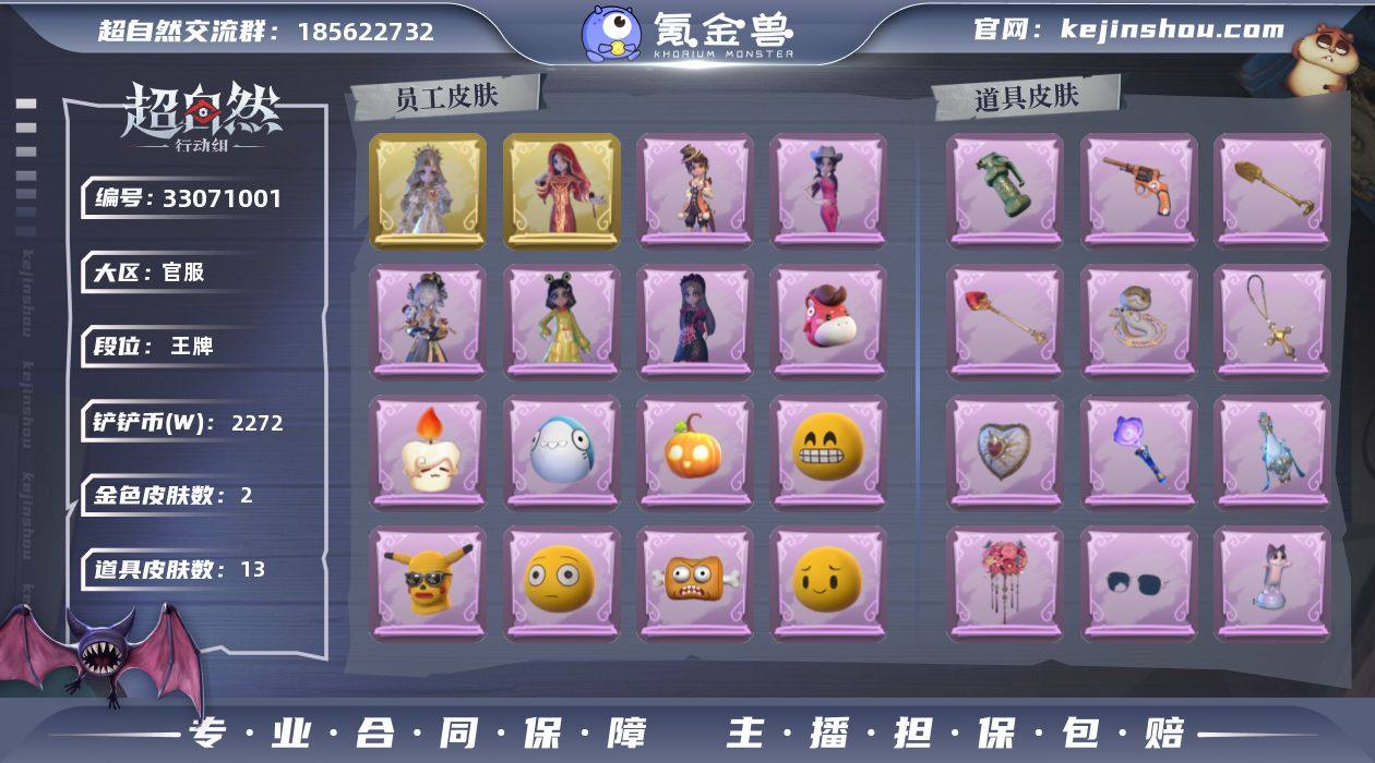 金皮2;紫皮5;道具皮13;皮肤:巫铃儿-镜花辞,薇薇安-圣光之谕,莉莉-除妖小师妹,阿念-庆宴绮愿,爱丽丝-丝缕哀歌,爱丽丝-耀眼的你,小黄-呱呱雨衣;道具:急救包-蔷薇物语,夜视仪-金丝眼镜,铲子-龙鳞,黄牛能量饮料-青玉抱丹,音响-happy猫,闪光弹-金戈玄铜,摸金符-祝祷词,腰包-宝剑八,额外的背包-飞花令,专业手电-星寂,长鞭-小狗蛇点点鞭,铲子-圣心之泪,转轮手枪-新星时代;饰品:头饰-鱼头怪头套,头饰-嘻嘻头套,头饰-萨卡班甲鱼头套,头饰-惊魂南瓜头套,头饰-呆滞头套,头饰-马上有钱,头饰-面具马头套,头饰-炙热烧烤,头饰-卑微头套,头饰-哈士奇头套,头饰-太空鲨头套,头饰-腊肠扭扭,头饰-滑稽头套,头饰-烈焰红唇头套,头饰-小狗蛇点点头套,头饰-烛光纪念,头饰-像素朋克墨镜,头饰-后室幸存者头套,挂饰-不朽的今夜,挂饰-钗头凤,挂饰-天使消失的年代,挂饰-小鲨包包,挂饰-未竟乐园,背饰-牛啤背包,背饰-天使的呼唤,背饰-蝶恋花;动作:动作-九万字舞,动作-小雨摇,动作-新年摇,动作-DL摇,动作-鹏友摇,动作-心跳摇,动作-舞台中心,动作-要糖,动作-抬手,动作-举牌;工牌背景:工牌背景-卷珠帘,工牌背景-圣光之誓,工牌背景-点点萌伴;工牌动作:工牌动作-拜年,工牌动作-鸦影,工牌动作-蜕变,工...