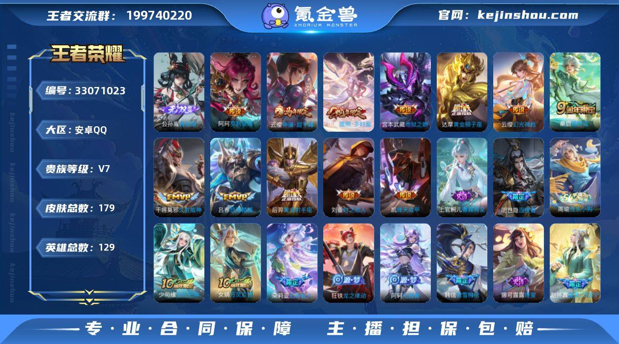 CHC11226 安卓Q-V7-至尊星耀II段位-129英雄-179皮肤-1无双-12传说-43史诗 【英雄全皮】:孙权全皮,敖隐全皮,影全皮 【无双皮肤】:公孙离离恨烟 【传说皮肤】:阿轲罗刹妄海,云缨神骥越千峰,虞姬愿照岁时盈,云缨幻光神枪,桑启鸣野蒿,吕布怒海麟威,铠绛天战甲,刘备时之恋人,干将莫邪久胜战神,达摩黄金狮子座,后羿黄金射手座,宫本武藏地狱之眼 【限定皮肤】:公孙离离恨烟,蒙犽顽岩魄,大乔绒语心约,姜子牙天穹之誓,狄仁杰阴阳师,赵云皇家上将,鲁班七号乒乒小将,高渐离玩趣恶龙,芈月幻夜卜梦,元歌无心,夏侯惇朔风刀,狄仁杰魔术师,狄仁杰万华元夜,达摩沙漠行僧,项羽海滩派对,韩信傲雪梅枪,兰陵王金庭之子,李元芳云中旅人,钟馗驱傩正仪,鬼谷子原初探秘者,黄忠火炮绅士,苏烈千军破阵,百里玄策原初追逐者,弈星混沌棋,沈梦溪大漠名商,裴擒虎李小龙,鲁班大师探海日志,桑启海盐诗旅,艾琳女武神,张良古海寻踪,鬼谷子天穹祈灯,沈梦溪龙舞盛年,刘邦剑破天穹,程咬金群星魔术团,周瑜熔金海岸 【年限皮肤】:虞姬愿照岁时盈 【赛季限定】:夏侯惇朔风刀,弈星混沌棋,鬼谷子原初探秘者,狄仁杰万华元夜,钟馗驱傩正仪,苏烈千军破阵,达摩沙漠...