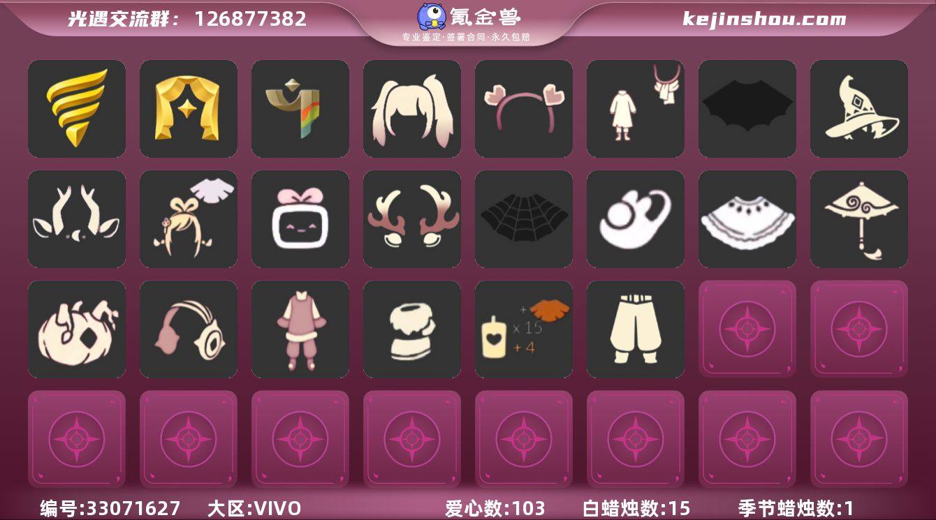 【A1287】区服:VIVO服,登入方式:手机【7季卡】白枭新年裤拖鞋鹿角巫师帽绊爱蜘蛛斗蝙蝠斗红伞,蜡烛数量:15,爱心:103,当前身高1.400,最高身高1.147,最矮身高13.147,已经毕业地图:晨岛,雨林,霞谷,已经毕业季节:彩染季,表演季,潜海季,稀有礼包:祥云瑞气服饰,史力奇套装,进行曲制服,玉兔拖鞋,雪人暖心靴,神鹿祝福头饰,圣诞鹿角,巫师帽,南瓜头,绊爱套装,渐变双马尾发型,心心相印发饰,创始人礼包,蜘蛛斗篷,蝙蝠斗篷,保暖雪人斗篷,白雪斗篷,祥云瑞气纸伞,冥龙南瓜,冰雪水晶球,中国绊爱大铁头,仙境茶会门扉,立式钢琴,热门物品:蝴蝶结,公主头,正太头,樱花头,猫猫头,武士裤,花环头饰,宴会围巾,虚荣发型,红耳机,花瓣斗篷,灯泡斗篷,白金斗篷,吉他,高音钢琴,雨伞