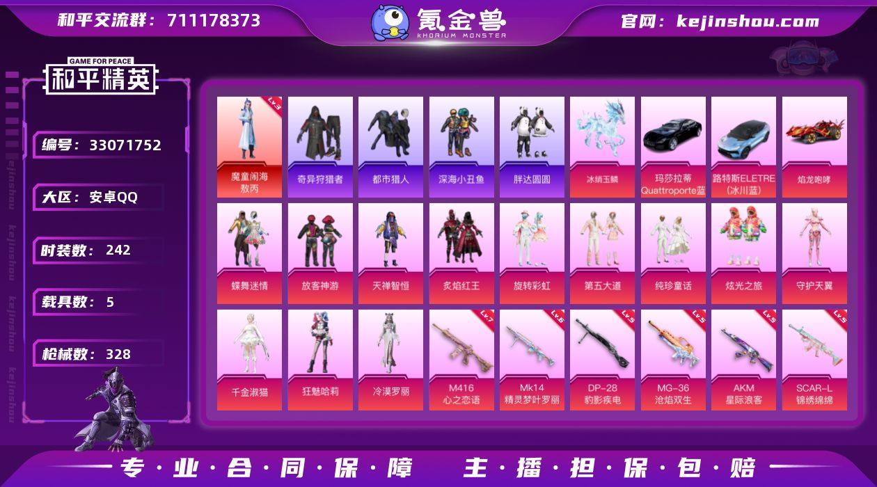 安卓 手Q-无敌战神框-1神装-15粉装-18特效枪-5载具-6粉色飞行器-112331热力值-19王牌印记-242套装-328枪皮 【红色神装等级】:魔童闹海-敖丙(三级) 【红色角色神装】:魔童闹海-敖丙 【热门品类】:套装-浪漫天命,套装-都市猎人,套装-深海小丑鱼,套装-奇异狩猎者,套装-胖达圆圆,套装-龟仙人,套装-暗影哥特,角色-8号机,角色-Mark.06,套装-红熊茄茄 【粉色套装】:粉装-蝶舞迷情,粉装-放客神游,粉装-天禅智恒,粉装-炙焰红王,粉装-旋转彩虹,粉装-第五大道,粉装-纯珍童话,粉装-炫光之旅,角色-守护天翼,角色-千金淑猫,角色-狂魅哈莉,角色-冷漠罗丽,角色-霁蓝缠春,人物-小舞·灵珑,人物-小舞·雪昙 【粉色枪皮等级】:AKM-星际浪客(五级),SCAR-L-锦绣绵绵(五级),M416-五爪金龙(四级),M416-心之恋语(七级),GROZA-镜光银凌(五级),AUG-暖羊咩咩(五级),蜜獾-异瞳寒姬(四级),UMP45-量子极限(五级),汤姆逊-热量炸弹(五级),AKS-74U-森灵之息(五级),Kar98K-巳巳如意(五级),Mk14-精灵梦叶罗丽(六级),Mk14-福马献瑞(五级),M417-第五大道(二级),DP-28-千金淑猫(五级),DP-28-豹影疾电(五级),MG-36-沧焰双生(五级),平底锅-仲夏莫吉托(三级) 【粉色载具】:...
