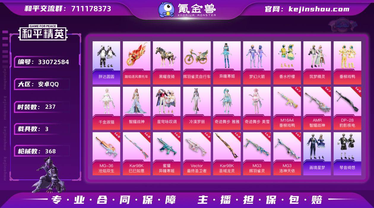 安卓 手Q-13粉装-13特效枪-3载具-9粉色飞行器-116829热力值-15王牌印记-237套装-368枪皮 【热门品类】:粉装-梦幻火箭,角色-军刀雅典娜,套装-胖达圆圆,套装-粉红小猪 【粉色套装】:粉装-梦幻火箭,粉装-香水柠檬,粉装-筑梦精灵,粉装-垂柳戏鸭,角色-千金淑猫,角色-智耀战神,粉装-星穹咏叹调,角色-冷漠罗丽,角色-奇迹舞步 雅雅,角色-奇迹舞步 美雪,角色-异瞳寒姬,角色-罪夜之冕,角色-虹云熊熊 【粉色枪皮等级】:AKM-暮色玫影(三级),M16A4-垂柳戏鸭(七级),蜜獾-异瞳寒姬(三级),ACE32-萌骑漫游(五级),Vector-最终圣卫者(三级),Kar98K-巳巳如意(五级),Kar98K-圣域龙灵(三级),Mk14-福马献瑞(一级),AMR-智耀战神(七级),DP-28-豹影疾电(五级),MG3-洛神天依(一级),MG3-辉羽雀灵(三级),MG-36-沧焰双生(五级) 【粉色载具】:踏焰逐风摩托车,僚机-圣域龙宝,黑曜夜骑,辉羽雀灵自行车 【粉色枪皮】:AKM-暮色玫影,M16A4-垂柳戏鸭,蜜獾-异瞳寒姬,ACE32-萌骑漫游,Vector-最终圣卫者,Kar98K-巳巳如意,Kar98K-圣域龙灵,Mk14-福马献瑞,AMR-智耀战神,DP-28-豹影疾电,MG3-洛神天依,MG3-辉羽雀灵,MG-36-沧焰双生 【粉色飞行器】:炫彩糖果飞行器,梦幻火...