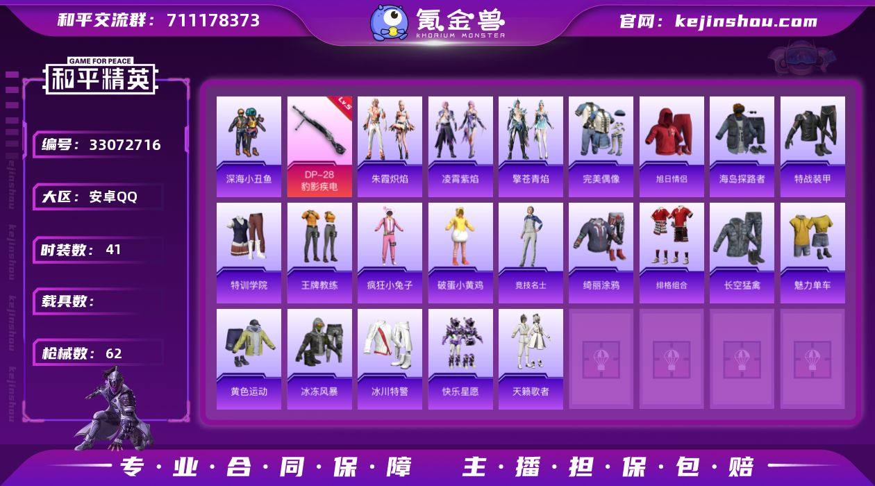 不可二次 安卓 手Q-0粉装-3特效枪-0载具-1粉色飞行器-14767热力值-2王牌印记-41套装-62枪皮 QW264403 【热门品类】:套装-深海小丑鱼 【粉色枪皮等级】:UMP45-萌骑冒险(三级),Mk14-福马献瑞(五级),DP-28-豹影疾电(五级) 【粉色枪皮】:UMP45-萌骑冒险,Mk14-福马献瑞,DP-28-豹影疾电 【粉色飞行器】:炫彩糖果飞行器 【粉色降落伞】:异瞳寒姬降落伞,炫彩糖果降落伞,镜花水月降落伞 【稀有套装】:套装-雪国风尚,套装-炫彩糖果,套装-马上有钱,套装-朱霞炽焰,套装-凌霄紫焰,套装-擎苍青焰,套装-雨过天青,套装-红釉青花 【稀有枪皮】:AKM-龙的传人,SCAR-L-夜灯,M416-蓝色火焰,GROZA-影袭,AUG-甜蜜菠萝,M762-彩虹符号,ARX-凌霄紫焰,UZI-影袭,UMP45-蓝色火焰,Vector-彩虹符号,汤姆逊-天降萌叽,汤姆逊-奇异狩猎者,汤姆逊-像素花束,JS9-凌霄紫焰,P90-霜月狼主,M24-仲夏莫吉托,SKS-糯团青竹,S12K-夜灯,DP-28-彩虹符号,MG3-幻世战舞者,MG-36-凌霄紫焰,P92-凌霄紫焰,平底锅-凌霄紫焰 【其他套装】:套装-完美偶像,套装-旭日情侣,套装-海岛探路者,套装-特战装甲,套装-特训学院,套装-王牌教练,套装-疯狂小兔子,套装-破蛋小黄鸡,套装-竞技名...