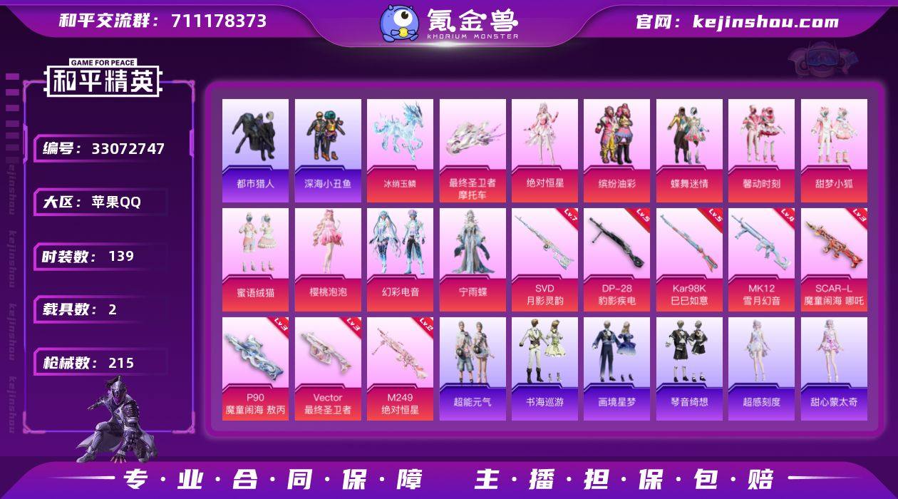A1562苹果 手Q-无敌战神框-1神装-10粉装-9特效枪-2载具-12粉色飞行器-70570热力值-8王牌印记-139套装-215枪皮 【红色神装等级】:暮色玫影-艾丽娅(三级) 【红色角色神装】:暮色玫影-艾丽娅 【热门品类】:粉装-缤纷油彩,套装-浪漫天命,套装-都市猎人,套装-深海小丑鱼,套装-潮萌小黄鸭,套装-软软马卡龙,套装-红熊茄茄 【粉色套装】:角色-绝对恒星,粉装-蝶舞迷情,粉装-缤纷油彩,粉装-馨动时刻,粉装-甜梦小狐,粉装-蜜语绒猫,角色-樱桃泡泡,粉装-幻彩电音,角色-宁雨蝶,角色-虹云熊熊 【粉色枪皮等级】:AKM-暮色玫影(三级),SCAR-L-魔童闹海 哪吒(三级),Vector-最终圣卫者(三级),P90-魔童闹海 敖丙(三级),Kar98K-巳巳如意(五级),SVD-月影灵韵(七级),MK12-雪月幻音(四级),M249-绝对恒星(二级),DP-28-豹影疾电(五级) 【粉色载具】:最终圣卫者摩托车,冰绡玉鳞 【粉色枪皮】:AKM-暮色玫影,SCAR-L-魔童闹海 哪吒,Vector-最终圣卫者,P90-魔童闹海 敖丙,Kar98K-巳巳如意,SVD-月影灵韵,MK12-雪月幻音,M249-绝对恒星,DP-28-豹影疾电 【粉色飞行器】:绝对恒星飞行器,炫彩糖果飞行器,晶梦幻蝶飞行器,戏水时光飞行器,雀灵庇佑飞行器,终晖之翼飞行器...