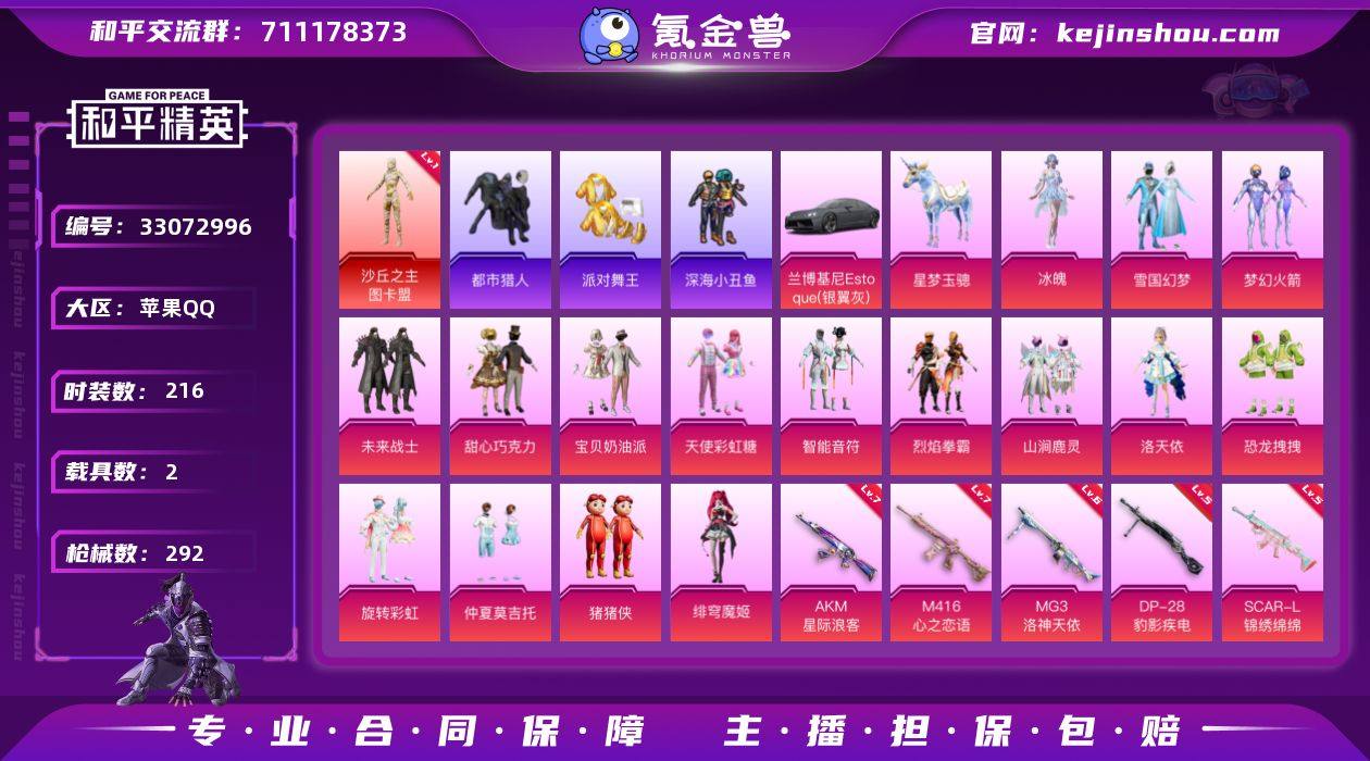 A1698苹果 手Q-无敌战神框-1神装-16粉装-15特效枪-2载具-5粉色飞行器-102694热力值-17王牌印记-216套装-292枪皮 【红色神装等级】:沙丘之主-图卡盟(一级) 【红色角色神装】:沙丘之主-图卡盟 【热门品类】:粉装-雪国幻梦,粉装-梦幻火箭,套装-浪漫天命,套装-都市猎人,套装-派对舞王,套装-深海小丑鱼,角色-军刀雅典娜,套装-龟仙人,套装-暗影哥特 【粉色套装】:粉装-未来战士,粉装-甜心巧克力,粉装-宝贝奶油派,粉装-天使彩虹糖,粉装-雪国幻梦,粉装-梦幻火箭,粉装-智能音符,粉装-烈焰拳霸,粉装-山涧鹿灵,角色-洛天依,粉装-恐龙拽拽,粉装-旋转彩虹,粉装-仲夏莫吉托,玩偶服-猪猪侠,角色-绯穹魔姬,角色-冰魄 【粉色枪皮等级】:AKM-星际浪客(七级),M16A4-垂柳戏鸭(一级),SCAR-L-锦绣绵绵(五级),SCAR-L-灵驹仙姬(二级),M416-五爪金龙(一级),M416-心之恋语(七级),AUG-星梦奇缘(三级),UMP45-萌骑冒险(二级),Vector-环太平洋(五级),AKS-74U-森灵之息(五级),Kar98K-巳巳如意(五级),Mk14-福马献瑞(三级),M417-绛云霓裳(三级),DP-28-豹影疾电(五级),MG3-洛神天依(六级) 【粉色载具】:兰博基尼Estoque(银翼灰),星梦玉骢 【粉色枪皮】:AKM-星际...