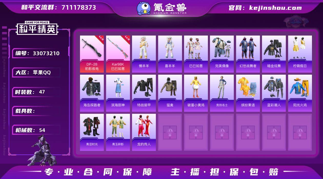 A1752苹果 手Q-1粉装-4特效枪-0载具-2粉色飞行器-16068热力值-7王牌印记-47套装-54枪皮 【粉色套装】:角色-辉云木星 【粉色枪皮等级】:ACE32-萌骑漫游(五级),Kar98K-巳巳如意(五级),Mk14-福马献瑞(二级),DP-28-豹影疾电(五级) 【粉色枪皮】:ACE32-萌骑漫游,Kar98K-巳巳如意,Mk14-福马献瑞,DP-28-豹影疾电 【粉色飞行器】:炫彩糖果飞行器,极意拳锋飞行器 【粉色降落伞】:绝对恒星降落伞,极意拳锋降落伞,炫彩糖果降落伞,辉云木星降落伞 【稀有套装】:套装-巳巳如意,套装-雪国风尚,套装-炫彩糖果,套装-马上来财,玩偶服-懒羊羊,玩偶服-喜羊羊,角色-霜刃之御 【稀有枪皮】:SCAR-L-炫彩节奏,AC-VAL-天降萌叽,UZI-天降萌叽,UMP45-夜灯,汤姆逊-像素花束,P90-巳巳如意,AMR-喜羊羊与灰太狼,DBS-彩虹符号,DBS-幻彩电音,爆炸猎弓-喜羊羊与灰太狼,突击盾牌-绝对恒星,破片手榴弹-巳巳如意 【其他套装】:套装-完美偶像,套装-幻世战舞者,套装-暗金炫舞,套装-柠萌假日,套装-海岛探路者,套装-滨海厨神,套装-特战装甲,套装-猛禽,套装-破蛋小黄鸡,套装-竞技名士,套装-缤纷果语,套装-蓝彩潮人,套装-阳光火鸡,套装-青涩时光,套装-青玉碎影,套装-...