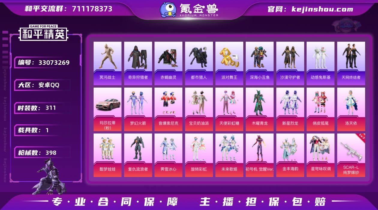 A1833安卓 手Q-20粉装-17特效枪-1载具-9粉色飞行器-133774热力值-15王牌印记-311套装-398枪皮 【热门品类】:粉装-梦幻火箭,粉装-音爆索尼克,套装-浪漫天命,套装-赤蝎幽灵,套装-都市猎人,套装-冥河战士,套装-派对舞王,套装-深海小丑鱼,套装-小丑鱼,套装-奇异狩猎者,套装-天网终结者,套装-沙漠守护者,套装-忍者信条,套装-星河浪客,套装-暗夜行者,套装-动感兔斯基人偶服,套装-龟仙人,套装-暗影哥特,角色-8号机,角色-Mark.06,大砍刀-青龙偃月刀,撬棍-龙胆亮银枪,熔岩游骑兵连帽夹克 【粉色套装】:粉装-宝贝奶油派,粉装-天使彩虹糖,粉装-木曜青龙,粉装-梦幻火箭,粉装-新星烈龙,粉装-俏皮狐尾,角色-洛天依,粉装-酣梦娃娃,角色-复仇流浪者,粉装-霁雪冰心,粉装-旋转彩虹,粉装-音爆索尼克,粉装-未来歌姬,角色-初号机 觉醒Ver.,粉装-金丰海韵,粉装-星穹咏叹调,角色-罪夜之冕,角色-谜鸦审判,角色-镜中幻,人物-小舞·雪昙 【粉色枪皮等级】:AKM-梦之光华(六级),AKM-绿萝繁花(五级),SCAR-L-纯梦嫁纱(七级),SCAR-L-锦绣绵绵(五级),M416-五爪金龙(七级),AUG-星之彼岸(六级),M762-激战未来(六级),M762-鬼刀(一级),UMP45-量子极限(五级),A...