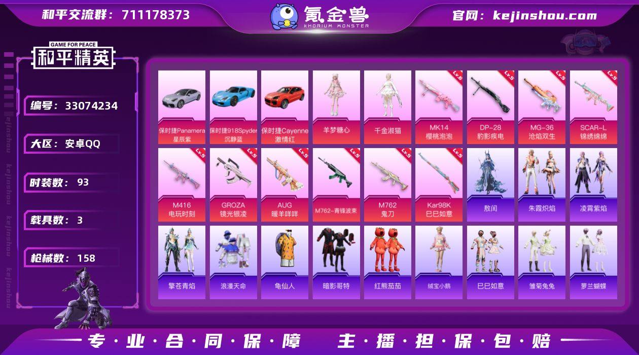 安卓 手Q-2粉装-13特效枪-3载具-3粉色飞行器-49623热力值-3王牌印记-93套装-158枪皮 【热门品类】:套装-浪漫天命,套装-龟仙人,套装-暗影哥特,套装-红熊茄茄 【粉色套装】:角色-千金淑猫,角色-羊梦糖心 【粉色枪皮等级】:SCAR-L-锦绣绵绵(五级),M416-电玩时刻(五级),GROZA-镜光银凌(五级),AUG-暖羊咩咩(五级),M762-青锋波束(五级),M762-鬼刀(五级),ACE32-萌骑漫游(四级),AKS-74U-森灵之息(五级),Kar98K-巳巳如意(五级),Mk14-樱桃泡泡(六级),Mk14-福马献瑞(五级),DP-28-豹影疾电(五级),MG-36-沧焰双生(五级) 【粉色载具】:保时捷Panamera(星辰紫),保时捷918 Spyder(沉静蓝),保时捷Cayenne(激情红) 【粉色枪皮】:SCAR-L-锦绣绵绵,M416-电玩时刻,GROZA-镜光银凌,AUG-暖羊咩咩,M762-青锋波束,M762-鬼刀,ACE32-萌骑漫游,AKS-74U-森灵之息,Kar98K-巳巳如意,Mk14-樱桃泡泡,Mk14-福马献瑞,DP-28-豹影疾电,MG-36-沧焰双生 【粉色飞行器】:炫彩糖果飞行器,祥瑞起舞飞行器,凤舞九天飞行器 【粉色降落伞】:阿狸红降落伞,星之彼岸降落伞,第五大道降落伞,蜜语绒猫降落伞,千金淑猫降落伞,临安公主降落伞,盛世惊鸿降落伞,炫彩糖果降落伞,...