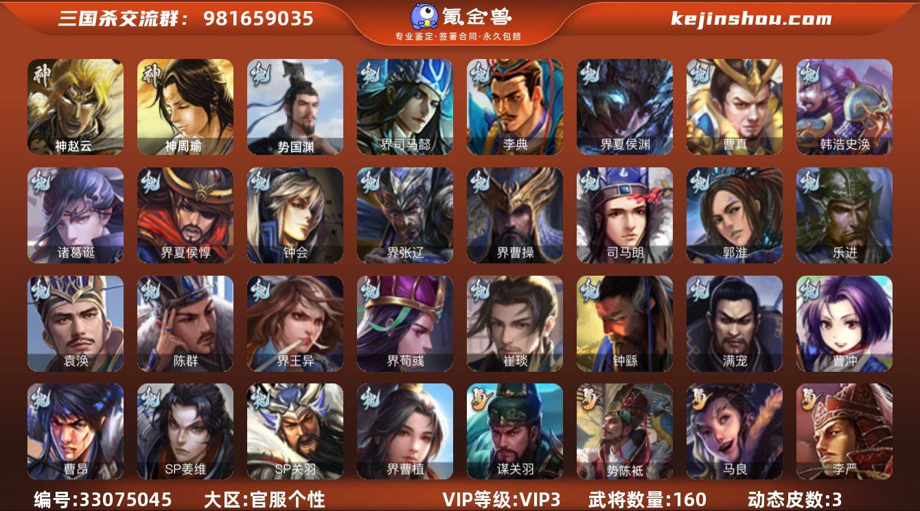 神赵云,势国渊,谋关羽,神周瑜,SP关羽,乐进,曹昂,诸葛诞,SP姜维,钟会,曹冲,郭淮,满宠,界王异,界曹操,界司马懿,界夏侯惇,界张辽,李典,曹真,韩浩史涣,陈群,钟繇,司马朗,界荀彧,界曹植,袁涣,崔琰,界夏侯渊,SP孙尚香,夏侯霸,马良,廖化,界马岱,关平,刘封,界关兴张苞,界刘备,界关羽,界赵云,界马超,SP徐庶,吴懿,周仓,张松,夏侯氏,马忠,李严,严颜,界庞统,杨仪,邓芝,界周仓,刘巴,界张嶷,谋张飞,界魏延,势陈祗,诸葛瑾,孙鲁育,程普,潘璋马忠,虞翻,界甘宁,界黄盖,界周瑜,界大乔,界陆逊,孙鲁班,朱桓,界孙权,吕岱,孙邵,陈武董袭,吕范,界孙休,界朱治,张布,友庞统,界袁术,伏皇后,李儒,华雄,袁术,界华佗,公孙瓒,蔡夫人,张鲁,SP黄月英,SP太史慈,卢植,张济,贾充,乐就,钟会-龙年端午(动态),孙权-牛年七夕(动态),张鲁-安民护祚(动态)
