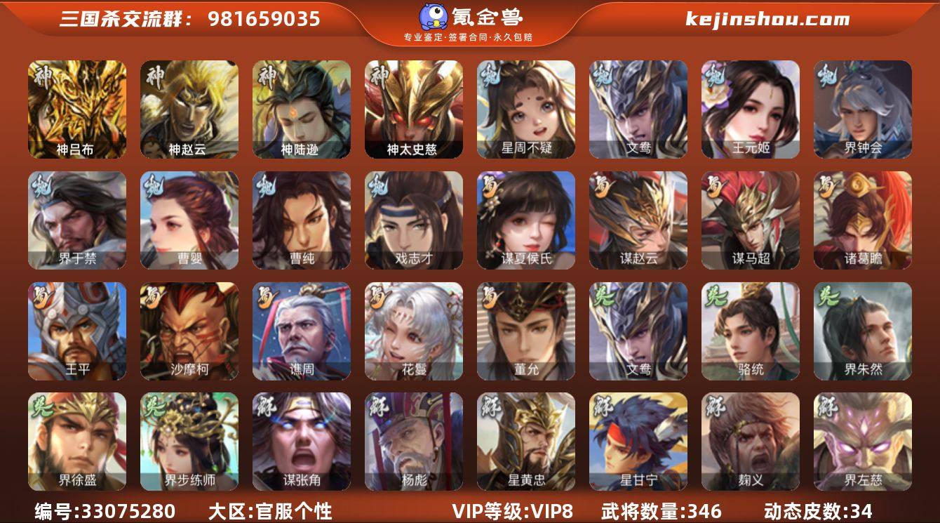 标题:S37043 VIP等级:VIP8 官阶:大将军 史诗武将数量:38 动态皮肤数量:34 史诗宝珠数量:25 将魂数量:684 雁翎数量:2042 心愿积分:9193 史诗武将(魏国):文鸯,曹婴,王元姬,界钟会,戏志才,星周不疑,界于禁,程昱,曹纯 史诗武将(蜀国):谋赵云,谋夏侯氏,沙摩柯,花鬟,谯周,王平,诸葛瞻,董允,谋马超 史诗武将(吴国):界徐盛,骆统,界步练师,界朱然,文鸯 史诗武将(群雄):星董卓,势于吉,杨彪,界左慈,麹义,谋张角,星甘宁,星黄忠,左慈,兀突骨,士燮,公孙康 史诗武将(神将):神太史慈,神赵云,神陆逊,神吕布 其他亮点:欢乐豆21579