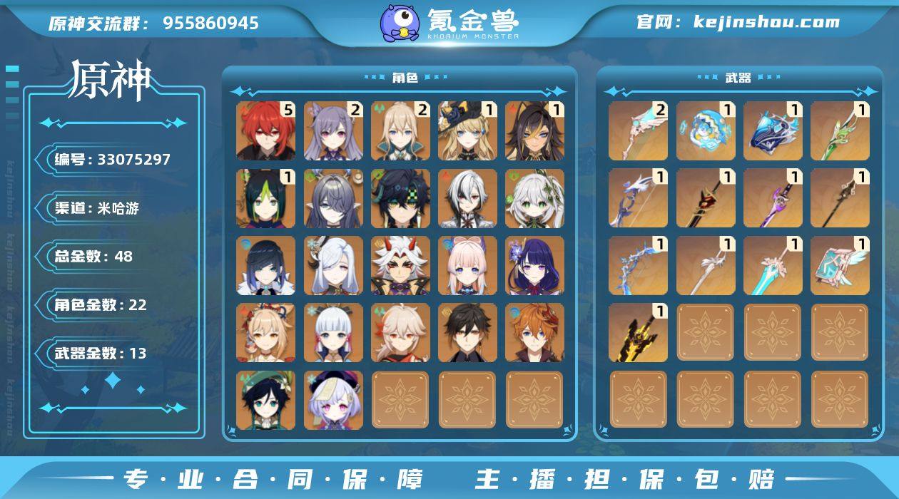 60级/48黄/女主/22个五星角色/13个五星武器 0命阿蕾奇诺,1命娜维娅,1命迪希雅,0命纳西妲,1命提纳里,0命夜兰,0命申鹤,0命荒泷一斗,0命雷电将军,0命枫原万叶,0命神里绫华,0命钟离,0命宵宫,0命温迪,0命达达利亚,0命珊瑚宫心海,2命刻晴,0命七七,2命琴,5命迪卢克,0命基尼奇,0命菈乌玛,精1万世流涌大典,精1裁叶萃光,精1若水,精1赤角石溃杵,精1冬极白星,精1雾切之回光,精1无工之剑,精1贯虹之槊,精2天空之翼,精1天空之卷,精1风鹰剑,精1天空之傲,精1冲浪时光