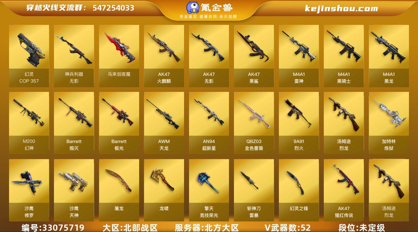 北方大区-56V-1王者武器数-0炫金武器数 【热门武器】:QBZ03-金色蔷薇,M200-幻神,死亡之眼,荣耀世冠-柯尔特*2,M4A1-黑骑士,汤姆逊-烈龙*2,加特林-炼狱,金色蔷薇-空,COP 357-幻灵,沙鹰-修罗*3 【音效卡】:AK47-火麒麟音效卡,M4A1-黑龙音效卡,Barrett-毁灭音效卡 【皮肤】:M200-幻神-N9-2022MVP,金色蔷薇-纸灯龙皮肤,雷神-暗月,AK47-火麒麟-传奇EVEN,火麒麟-心动糖果,毁灭-星空,毁灭-英雄计划 皮肤,黑龙-能量核心,屠龙-荣耀世冠AG 【角色】:零,樱,魅影,狐影,奇洋探员,乔伊教练,修道士,云海玲珑,暗夜-X,风暴女,虎妞,嘉年华灵狐,娟娟,葵-赛博朋克,兰-空鹰,兰-新年限定,灵狐者-X,灵狐者-七夕宝贝,灵狐者-职业经理,龙儿,龙儿-小淘气,麻雀,曼陀罗-X,女战神,潘多拉-X,潘多拉-甜心教官,潜龙队-X,青霞仙子,斯沃特-X,蜀雪,铁骑荣耀,雪莉杨,樱-青春偶像,樱-战斗天使,影武者-X 【人偶武器】:金色蔷薇-空,AWM-灵狐-15周年嘉年华,COP-旗袍,迷你深渊冰龙,迷你裂空之翼*2,迷你牛牛,深渊终结者手雷,灵狐娃娃手雷 【暴走生化】:黑龙吞噬者,死亡之眼 【挑战大师】:激光毁灭者III-白马银枪,激光毁灭者III,神圣爆裂者-末日III...