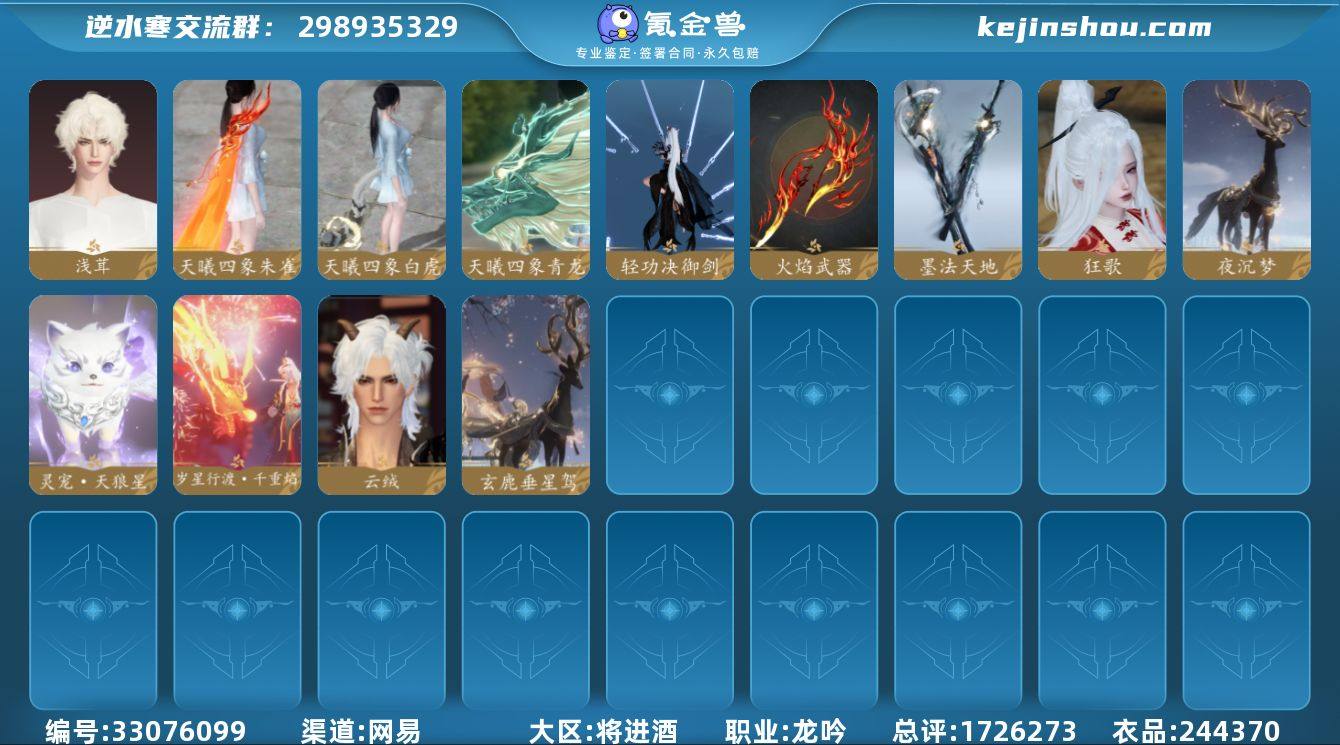 【区服】 武林萌主 【充值称号】 卧看千山 【已用天赏石】 33 【天霓染数量】 7 【天霓染】 暗夜序曲*1, 时隙旅者*1, 春梢剪锦*1, 星剑分野*1, 凌波*1, 霜寒*1, 迢迢霄汉*1 【天赏发型】 浅茸, 云绒, 狂歌 【天赏祥瑞】 玄鹿垂星驾, 夜沉梦 【天赏外观】 火焰武器, 蝴蝶武器, 水墨武器, 水武器, 轻功诀御剑, 天曦四象·白虎, 天曦四象·青龙, 天曦四象·朱雀, 岁星行渡·千重焰 【天赏灵宠】 灵宠·天狼星 【副本外观】 白夜拂雪*1, 霜途无间, 紫宿宸极, 星剑分野 【商城外观】 野径风途, 居居勇者, 夜锋漫迹, 星弈玄夜, 暗夜序曲, 宝禄纳财, 甜宙漫游, 如约鹅至, 雪庭问宋, 翠麟幽寒, 墨喧雪绒, 宸云疏雪, 夜雪闻梅, 金缕漠歌, 寂雾藏影, 盛夜星誓, 时隙旅者, 雾都往事, 糖云蜜杏, 雾蓝星瞳, 纯白月光, 云锦天香, 破曙征潮, 逸夏浮澜, 真嗣款战斗服, 跃动心芒, 朔雪从风, 福禄金刚, 鸿福昭运, 侠影流霜, 灵语星彩, 晴蓝逸思, 晴岸涛吟, 乌夜禁巡, 贪狼摄星, 紫微御宵, 兰亭觞咏, 衣香鬓影, 混天焚莲, 火鸾鸿衣, 瀚渊龙炎, 玉泽凌烟, 金粉绮梦, 烽火浮生, 赤狐魅语, 天纵恒尊, 白灵幻尘, 墨隐千秋, 枫华九霄, 极夜天曦, 玄都灼霜, 青瓷映月, 迢迢霄汉, 暮云苍野, 白羽武器 【祥瑞坐...