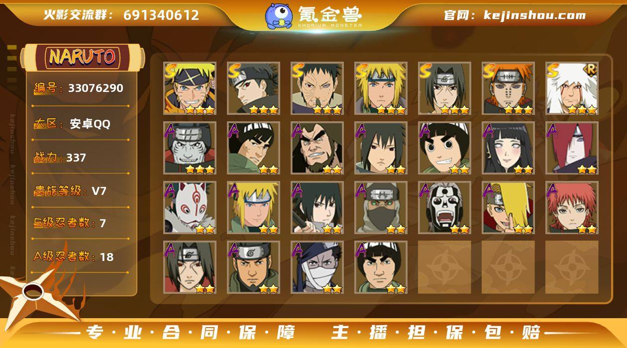 【HYSA1185】V7/战力337W/S忍7/A忍18/通灵兽13/二星A-飞段「死司凭血」/二星A-宇智波鼬/二星A-长门「青年」/二星A-迈特凯/二星A-桃地再不斩/三星S-宇智波带土 「忍界大战」/二星A-蝎/三星S-佩恩「天道」/三星S-漩涡鸣人·宇智波佐助/二星A-角都「地怨虞」/三星S-波风水门/三星A-干柿鬼鲛/二星A-李洛克「忍界大战」/二星A-神秘面具男 「忍者之路」/二星A-波风水门 「青年」/三星S-自来也「舞之豪杰」/三星S-宇智波止水「须佐能乎」/二星A-日向雏田 「最终章」/二星A-神农 「羁绊」/二星A-猿飞阿斯玛/二星A-宇智波泉奈/二星A-迪达拉/二星A-迈特凯「青春爆炸」/二星A-宇智波佐助「须佐能乎」/三星S-宇智波鼬 「须佐能乎」
