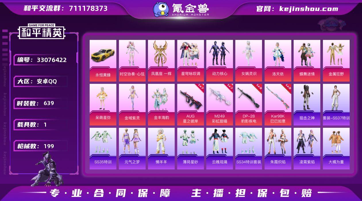 【主播推荐】实名: 不可修改 时装数: 639 载具数: 1 枪械数: 199 战备数: 147 热门装扮: 蝶舞迷情,金属狂野,洛天依,大橘为重,呆萌星弥,金域紫灵,金丰海韵,时空协奏·心弦,动力核心,女娲灵识,凤凰座 一辉,星穹咏叹调 载具: 永恒黄蜂 稀有枪皮: AUG星之彼岸,M249彩虹甜喵,Kar98K-巳巳如意,DP-28-豹影疾电