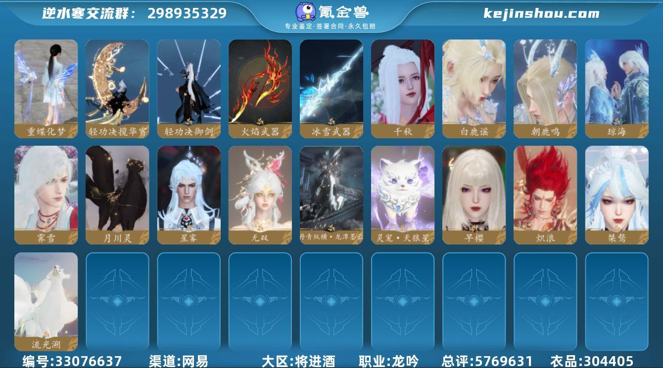 【区服】 武林萌主 【战力值】 63.09 【职业】 龙吟 【馆藏】 7级 【衣品值】 304405 【国色值】 108070 【已用天赏石】 36 【天霓染数量】 5 【充值称号】 卧看千山 【累计充值】 58192元 【剩余赠礼额度】 27108纹玉 【天霓染】 星宫遐音*1, 星落月皓*1, 古道西风*1, 曦曲*1, 倾心*1 【灵韵内功】 灼锋净域, 熔甲, 锐锋, 破戟 【稀有道具】 浑天劫 【副本外观】 白夜拂雪*1, 星落月皓 【天赏外观】 早樱, 星雾, 炽浪, 无双, 桀骜, 霁雪, 琼海, 朝鹿鸣, 白鹿谣, 千秋, 冰雪武器, 火焰武器, 雷霆武器, 水武器, 蝴蝶武器, 轻功诀揽华宵, 轻功诀御剑, 重蝶化梦, 丹青纵横·龙潭墨云 【天赏祥瑞】 月川灵, 流光溯 【祥瑞坐骑】 假面, 呆宝, 风行·江湖景, 布丁, 风行·世间情, 风行·万灯明, 云螭·庆舞迎春, 龙衔瑞焰, 风行·谦谦有礼, 金冠鼠鼠, 纵风甲车·赤, 粉黛娇, 幻琉晶, 狂霸天, 星河转·银昼, 星河转·金夕, 星河转·赤夜, 骋风叱焰, 贺岁喜狮, 伯力, 咩郎, 瓜皮, 墨流云·玄色, 墨流云·朱红, 墨流云·靛青, 奔虹赤, 踏星夜, 彩虹小马, 木小马, 云络, 银砂素波, 绒悠悠, 犬威哮月·沧, 犬威哮月·焰, 玉霄飞练, 灵物志·花绒, 梅香团子, 绒绒夜, 桃桃雪, 隐云涧, 逍遥游, 空山闲 【商...