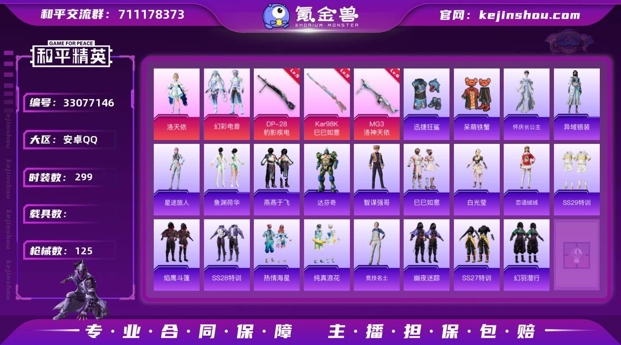 【特价出售】安卓Q-2粉装5特效枪3热门74套装125枪皮 34199热力值 9印记 历史传奇王牌14星 【2粉装】 洛天依 幻彩电音 【5特效枪】 Kar98K-巳巳如意 (5级) DP-28-豹影疾电 (5级) MG3-洛神天依 (4级) Mk14-福马献瑞 (2级) UMP45-萌骑冒险 (5级) 【3热门】 龟仙人 呆萌铁蟹 迅捷狂鲨