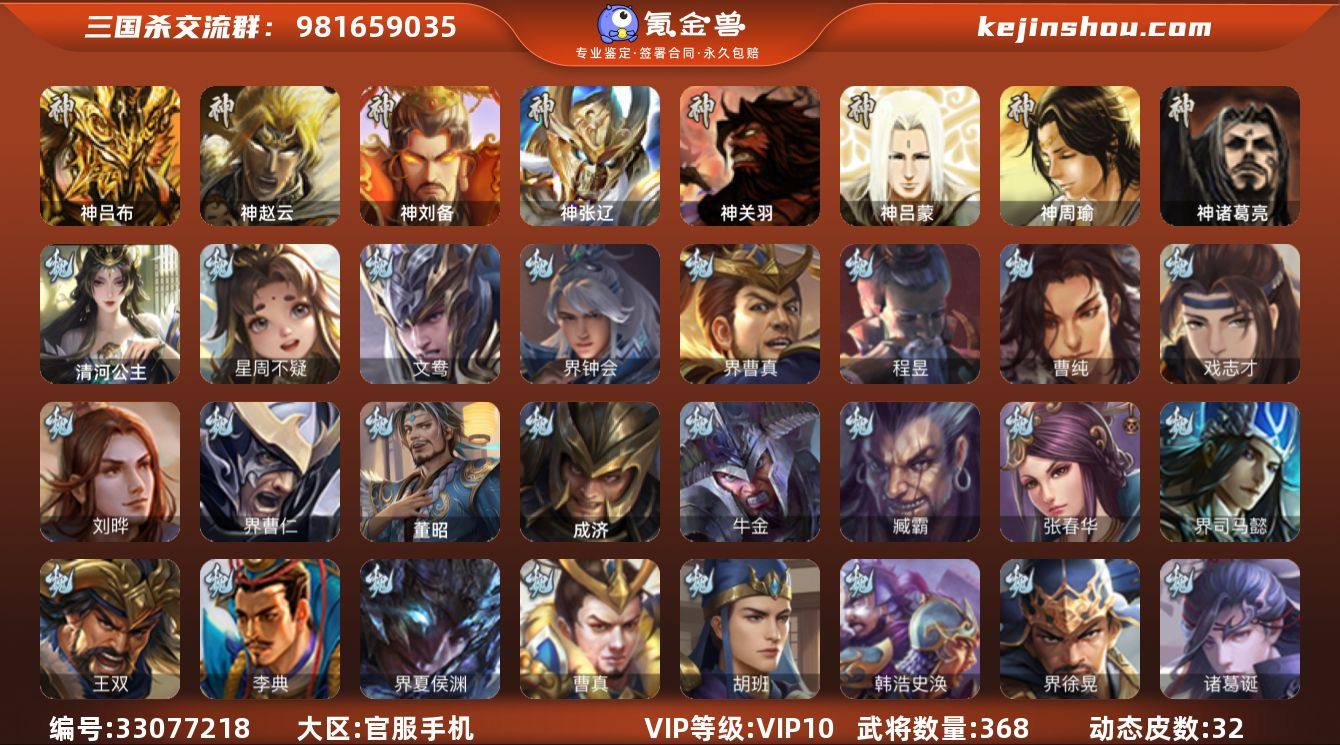 官阶:大将军;VIP等级:VIP10;史诗武将数量:41;动态皮肤数量:32;武将总数:368;史诗宝珠数量:0;将魂数量:1227;神将:5;魏国史诗武将:15;蜀国史诗武将:7;吴国史诗武将:7;群史诗武将:17 神吕布,神赵云,神刘备,神张辽,神诸葛亮,星周不疑,界钟会,界曹真,曹纯,戏志才,刘晔,清河公主,程昱,谋赵云,谋马超,诸葛瞻,赵襄,沙摩柯,界黄忠,花鬘,周处,骆统,留赞,界朱然,界徐盛,文鸯,裴秀,界沮授,左慈,张让,星黄忠,星甘宁,麹义,祢衡,沮授,界李儒,杜预,谋张角,许攸,星董卓,兀突骨,司马昭,神吕蒙,神周瑜,神关羽,SP关羽,SP蔡文姬,乐进,曹昂,诸葛诞,朱灵,文聘,SP姜维,张春华,钟会,曹冲,郭淮,满宠,界王异,界曹操,界司马懿,界夏侯惇,界张辽,界许褚,界郭嘉,李典,曹真,韩浩史涣,陈群,曹叡,曹休,钟繇,司马朗,王基,李通,郭皇后,辛宪英,界甄姬,吕虔,鲁芝,界荀彧,界徐晃,杜畿,界曹丕,界邓艾,界曹植,界满宠,界郭淮,卞夫人,蔡贞姬,袁涣,王双,崔琰,毛玠,谋于禁,牵招,胡班,成济,牛金,界夏侯渊,界曹仁,臧霸,董昭,势陈到,SP孙尚香,关银屏,夏侯霸,马良,关兴张苞,廖化,界马岱,关平,简雍,刘封,界法正,界关兴张苞,界刘备,界关羽,界张飞,界赵云,界马超,SP徐庶,吴懿,周仓,张松,刘谌,夏侯氏,糜竺,孙乾,吴苋,秦宓...